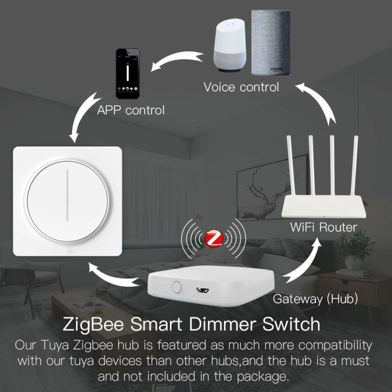3. Режим управления без помех; Позволяет управлять переключателем через приложение Smart Life, сенсорное управление и голосовое управление; Каждый метод управления работает независимо; Достижение мультиуправления путем подключения к другим умным переключателям; совместимость с Alexa и Google Home для голосового управления без помощи рук с регулируемой яркостью 0%-100%; Также можно управлять через приложение Smart Life/Tuya в любое время, Требуется и подключается к любому месту со специальным концентратором Tuya ZigBee 3,0.
