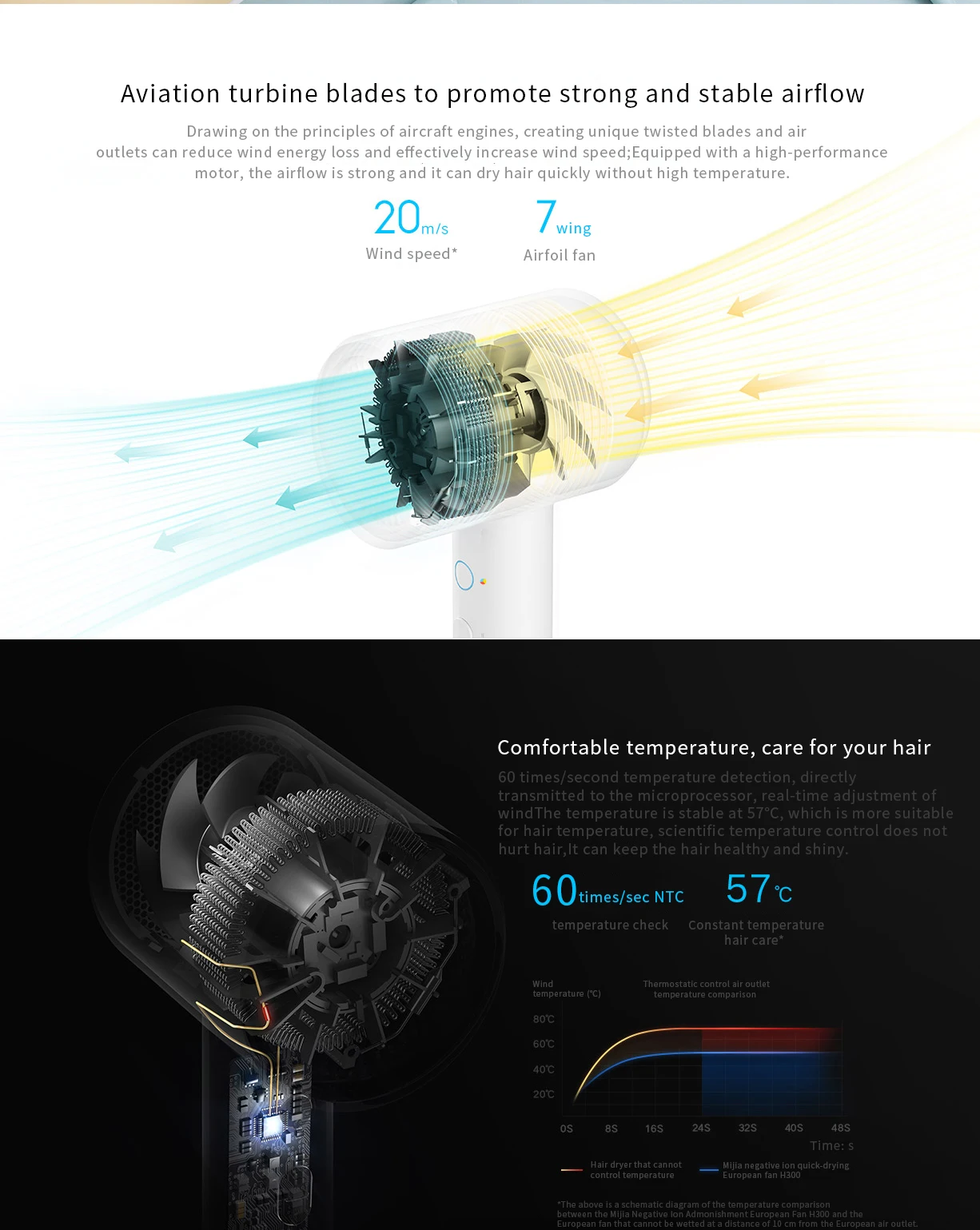 Быстросохнущий фен Xiaomi Mijia H300 20 мс скорость ветра57 C интел...