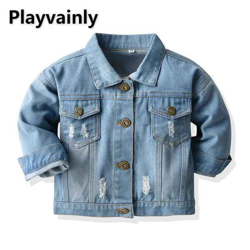 В 2021 году, новые куртки для мальчиков и девочек Детские пальто синий деним рваные Повседневные детские куртки для мальчиков и девочек детская одежда E20090