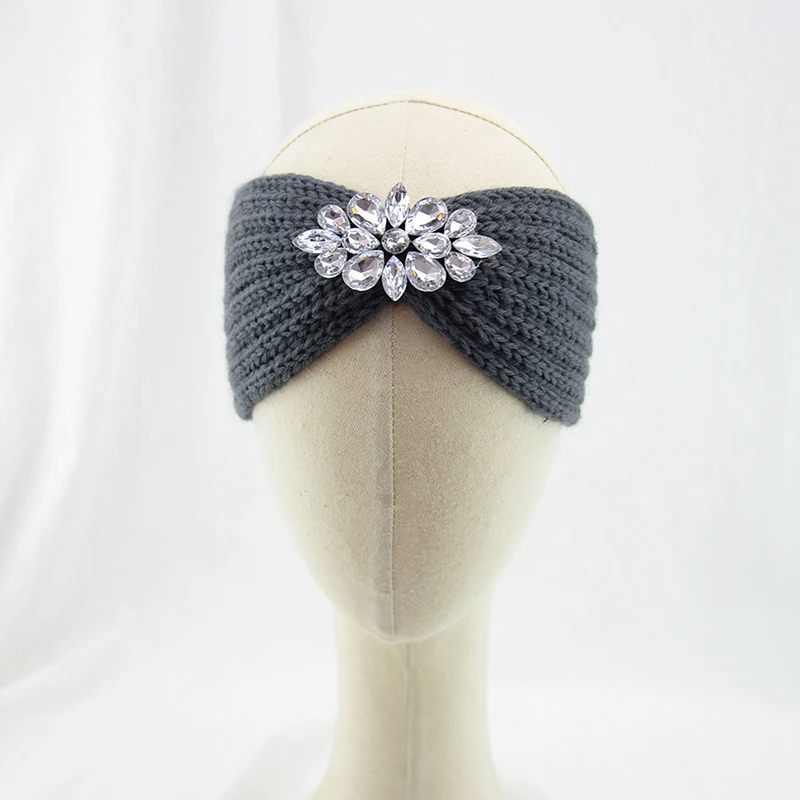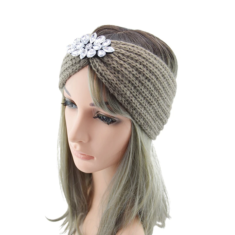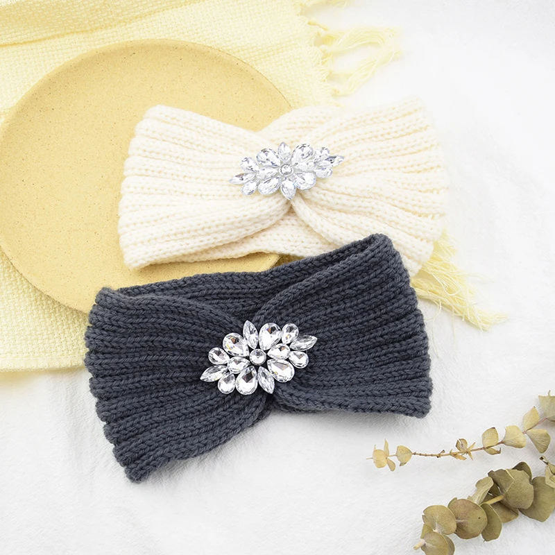 Утолщенная эластичная повязка для волос, вязаная крючком повязка на голову, стразы, вязаная повязка на голову, широкие аксессуары для волос, прозрачный цветок с кристаллами