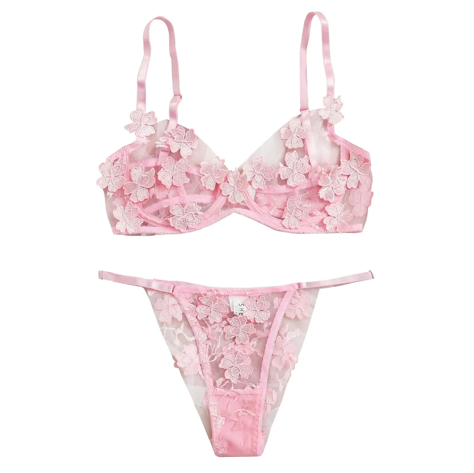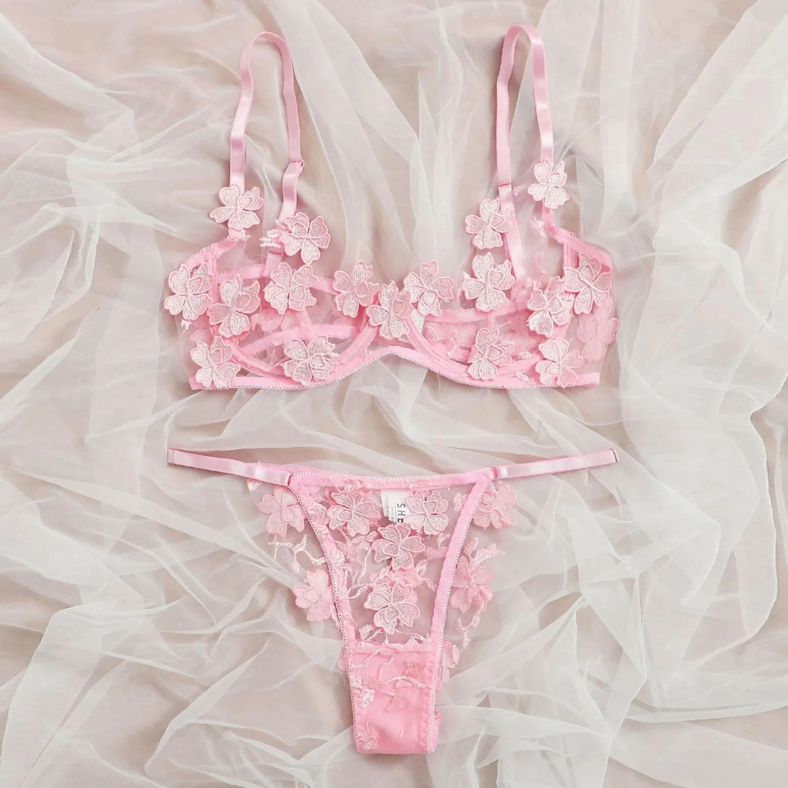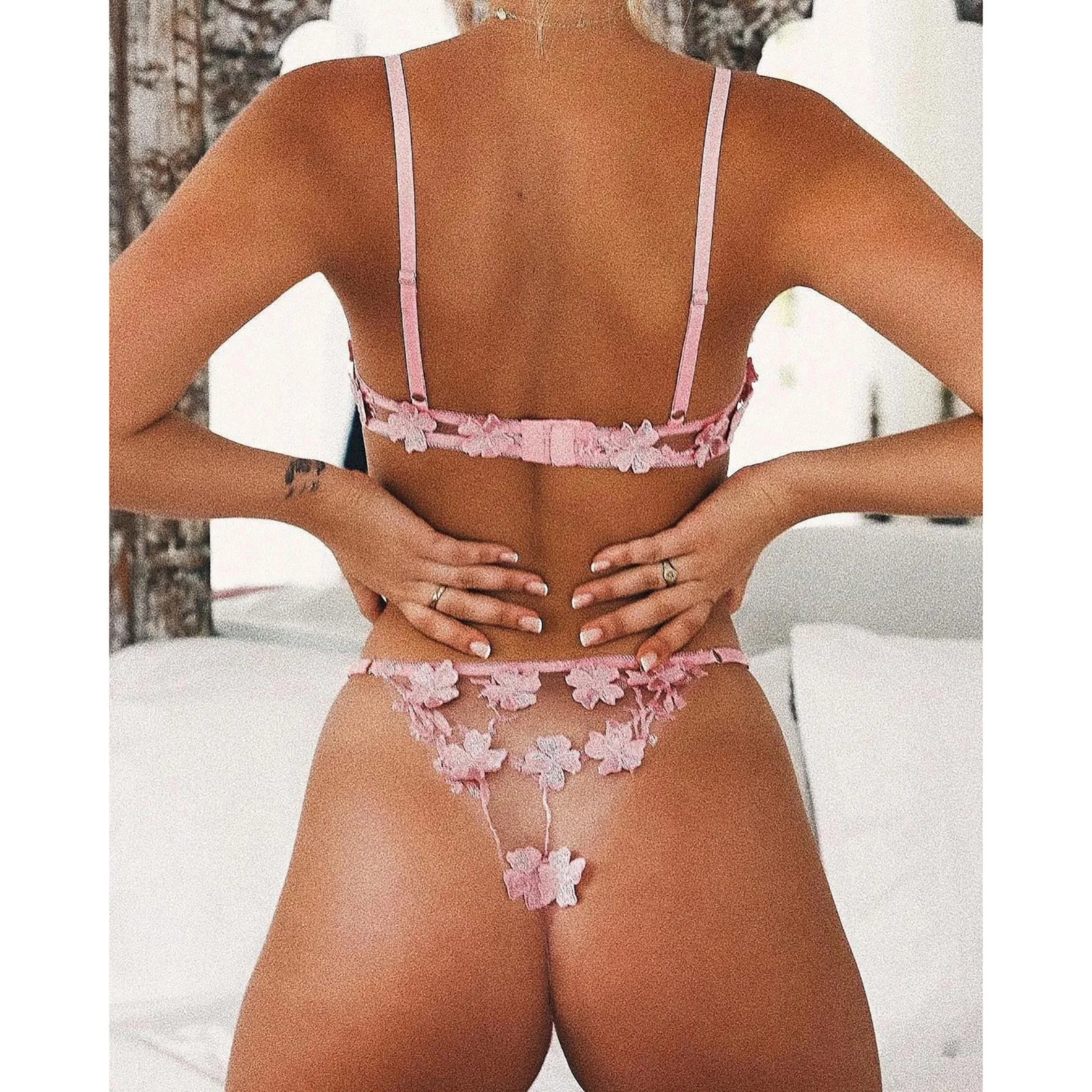 Комплект нижнего белья женский, прозрачный кружевной бюстгальтер с цветочной вышивкой и Трусы-стринги, на косточках, с чашками пуш-ап