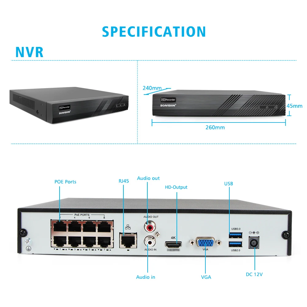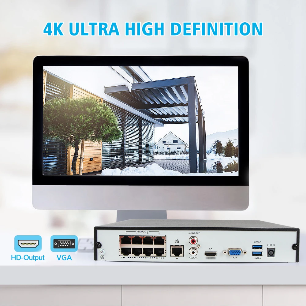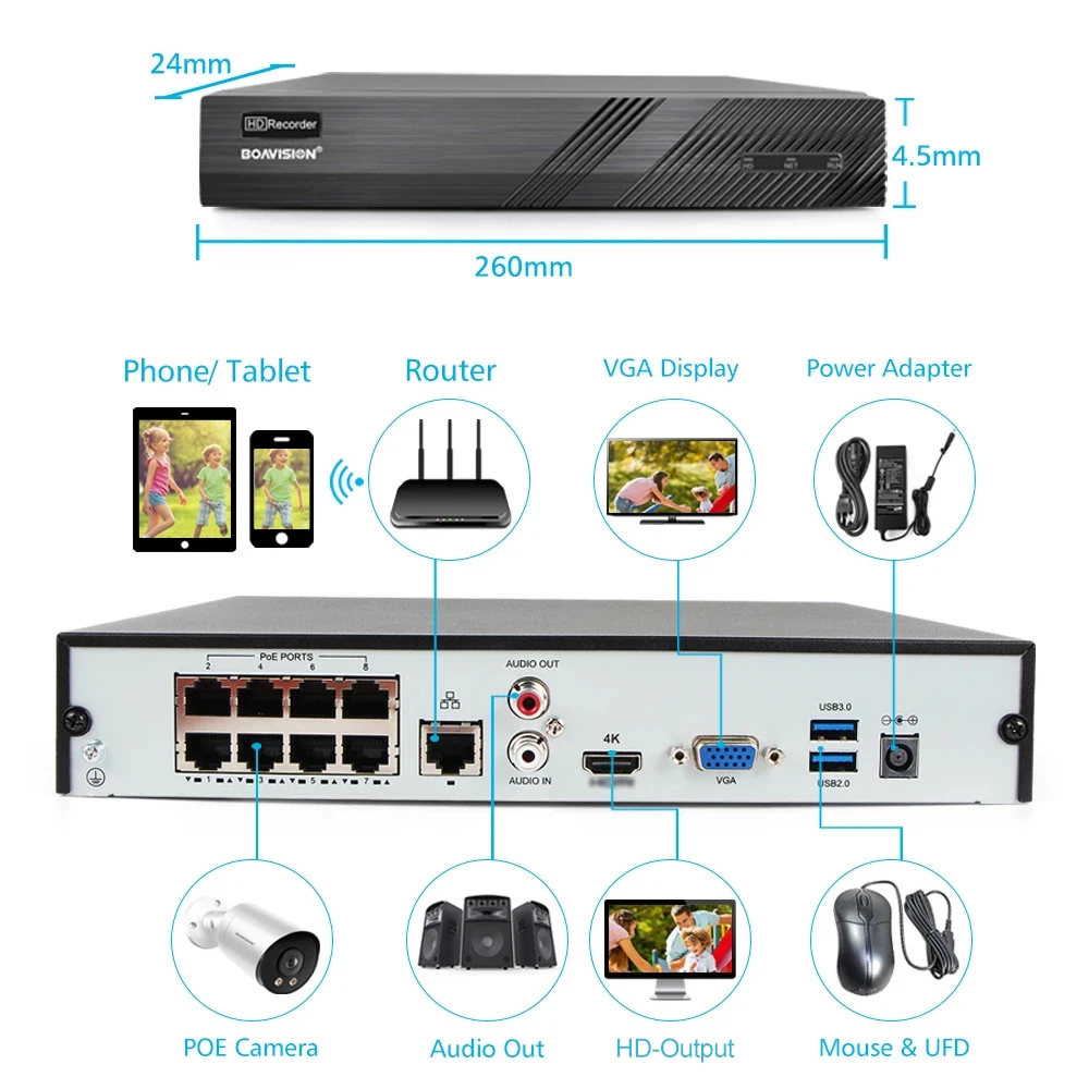 1x 8-канальный видеорегистратор с разрешением 4K 8MP HD H.265 PoE NVR