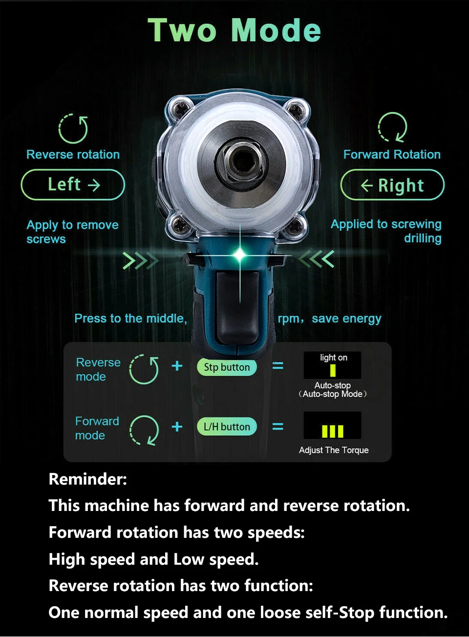 -520нм высокий крутящий момент, бесступенчатый переключатель переключения скорости.