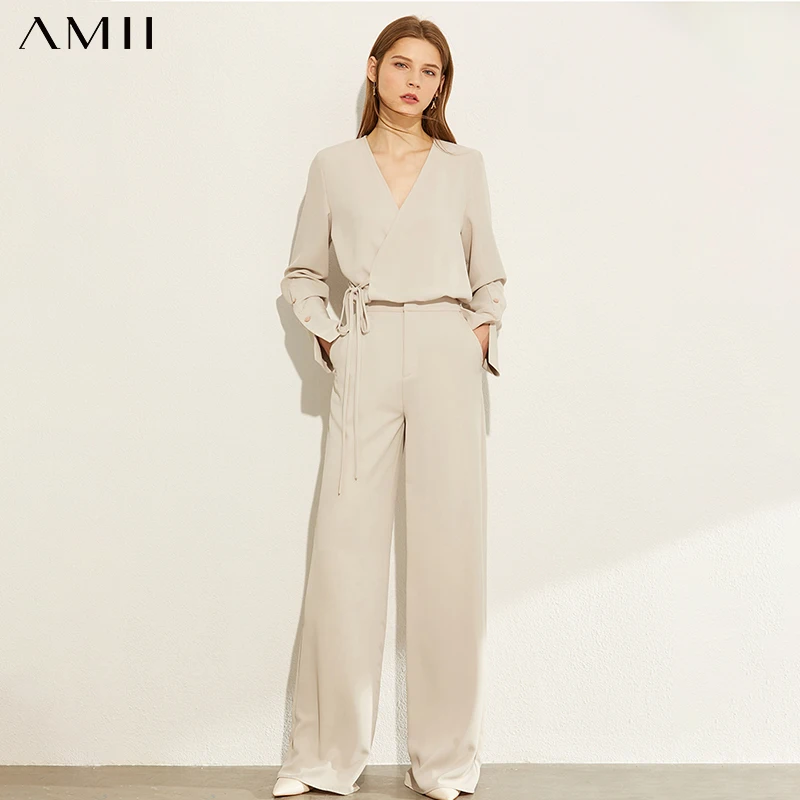 Комплект женский из однотонной блузки с V-образным вырезом и длинных брюк с высокой талией, на осень, 12030227