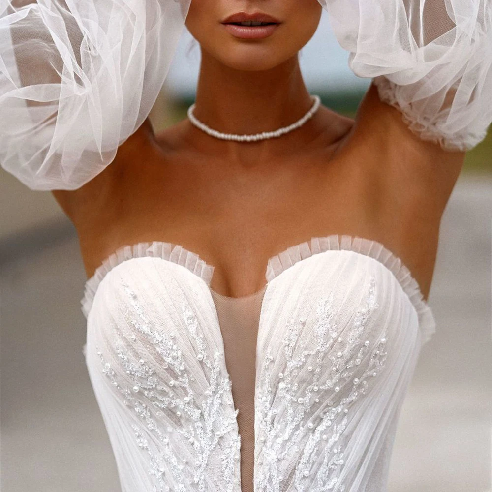 UZN свадебное платье в стиле бохо, а-силуэт 2021, без бретелек, со съемными пышными рукавами, Тюлевое кружевное плиссированное платье невесты с V-образным вырезом на заказ, свадебные платья в богемном стиле