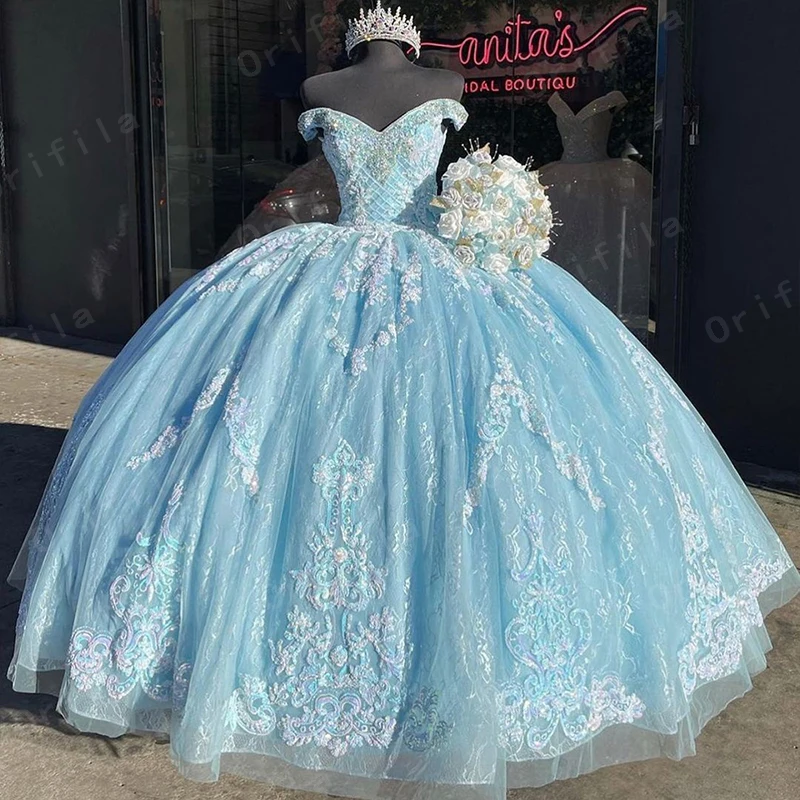 Женское платье с кружевной аппликацией, голубое платье с открытыми плечами из органзы, с бисером, 15 лет