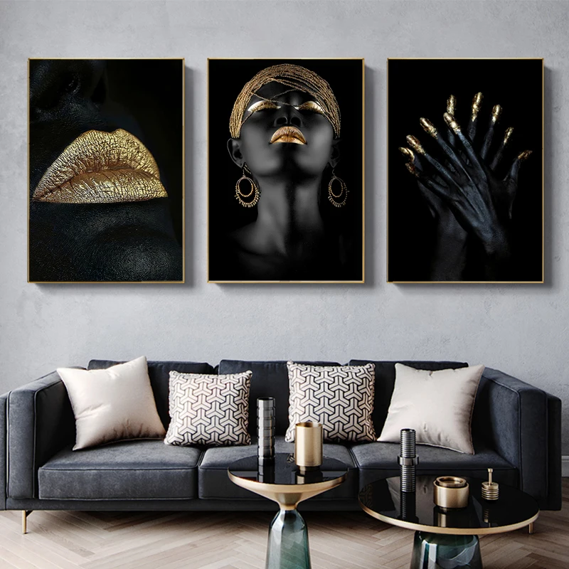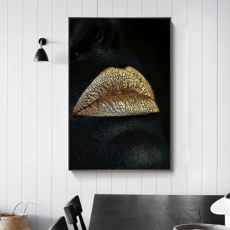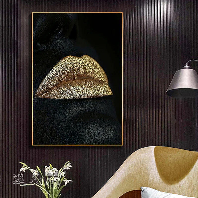 Черная женщина, Золотые губы, холст, живопись, Золотой Рот, плакаты и принты, скандинавский настенный искусство, современная картина для декора гостиной