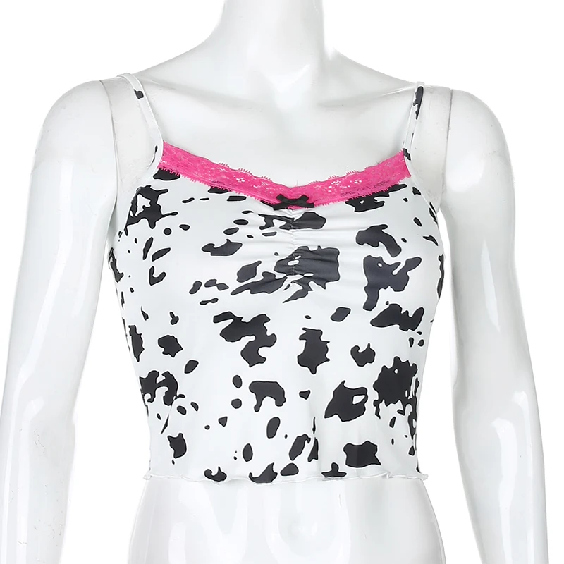 Кружевом в стиле пэчворк с принтом коровы милый топ Для женщин без рукавов сексуальное платье для вечеринки с v-образным вырезом уличная майка Y2K эстетическое