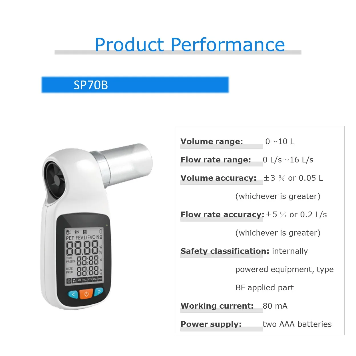 Спирометр-это ручное оборудование для исследования функции легких. Продукт подходит для клиник и семьи для тестирования параметров функции легких. Требуется, чтобы пользователь управлял устройством в соответствии с руководством пользователя
