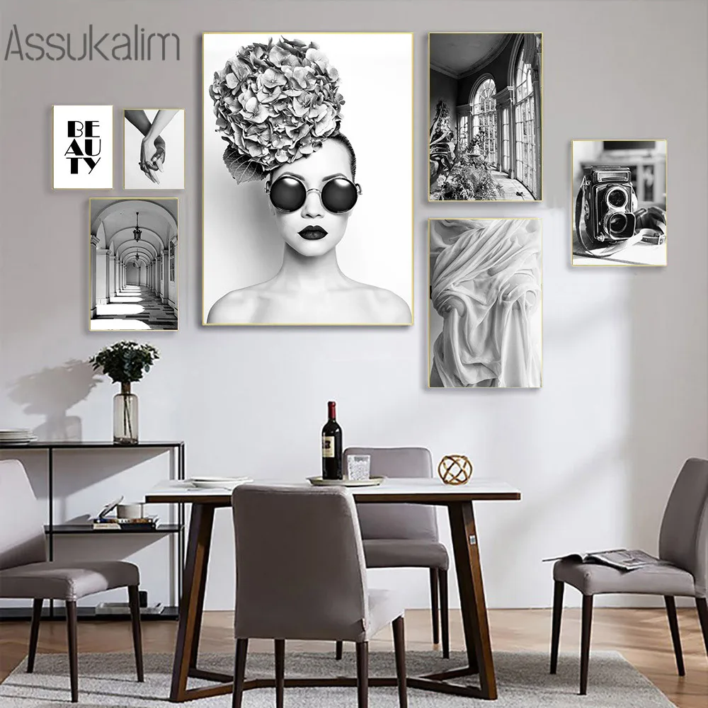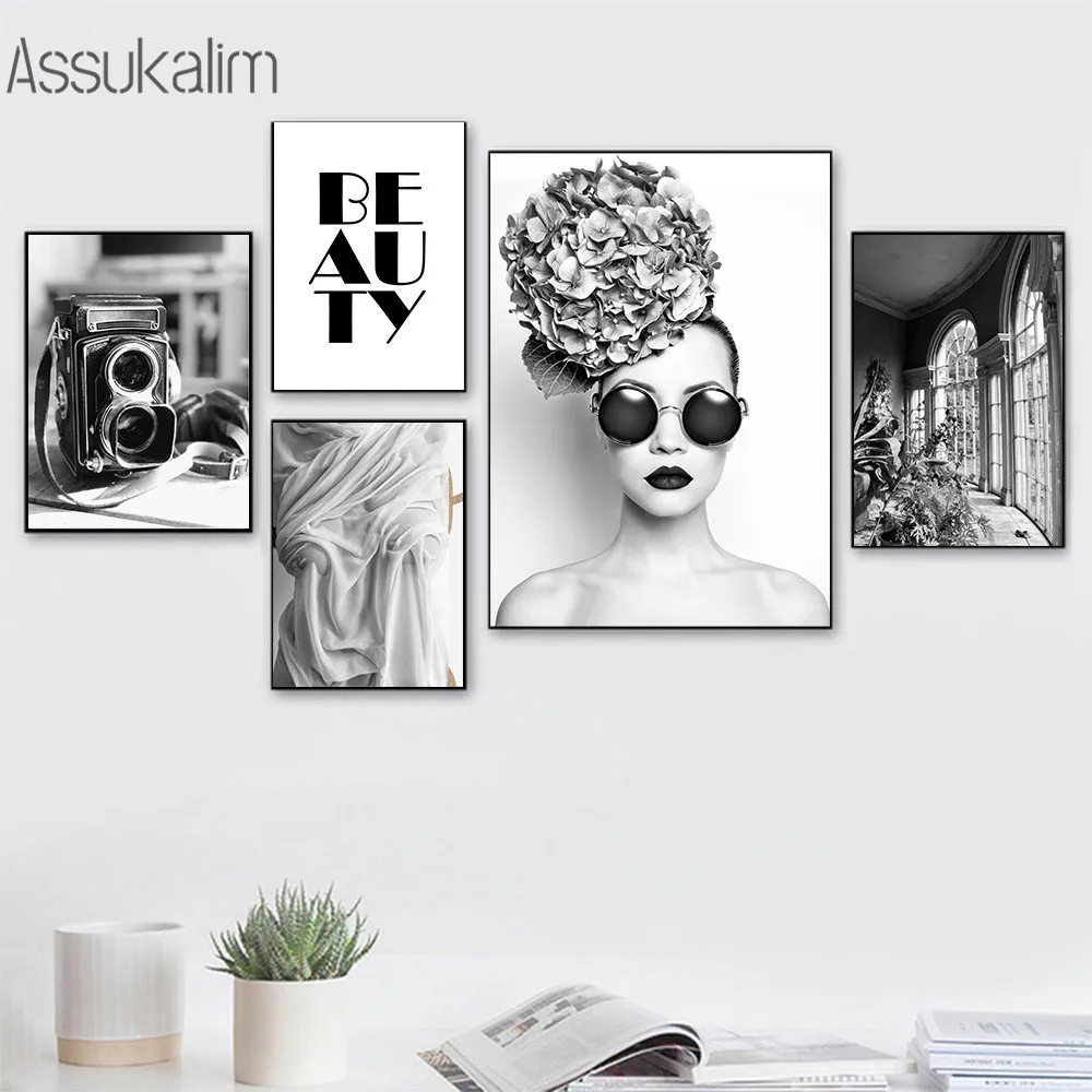 Черно-белый плакат, модная сексуальная девушка, печать на холсте, Настенная картина с камерой, Скандинавская Настенная картина, современный декор для гостиной