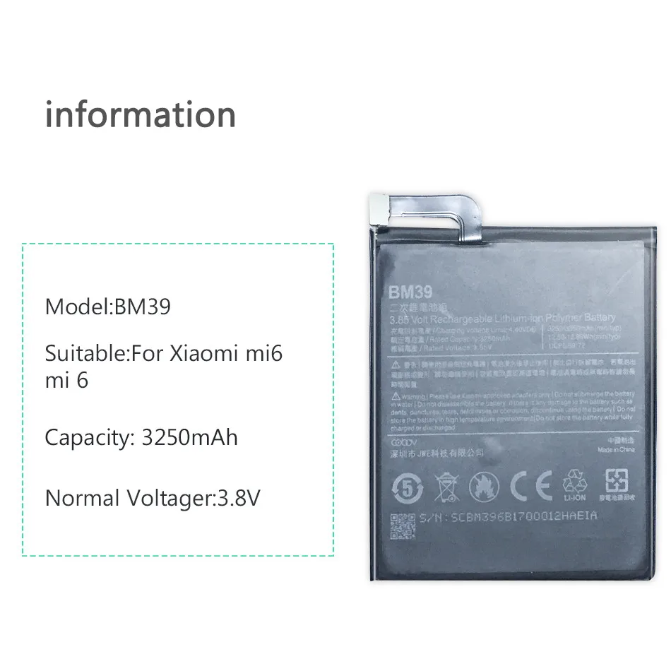Бесплатные инструменты 2020 новый для Xiao Mi Оригинальный аккумулятор для телефона BM39 для Xiaomi Mi 6 Mi6 3250mAh запасная батарея большой емкости