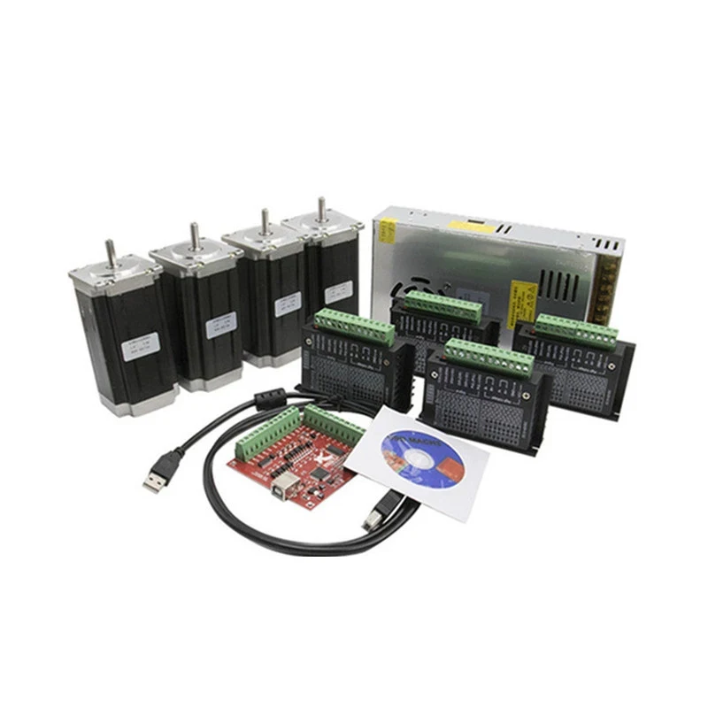 Включает: 1x36 В/9,7 А, 350 Вт, импульсный источник питания 4 драйвера шагового двигателя TB6600 или DM542 4 шаговых двигателя Nema23 425 oz/in 3A (l112 мм) 1 x 4-осевая коммутационная плата 1 х параллельный кабель