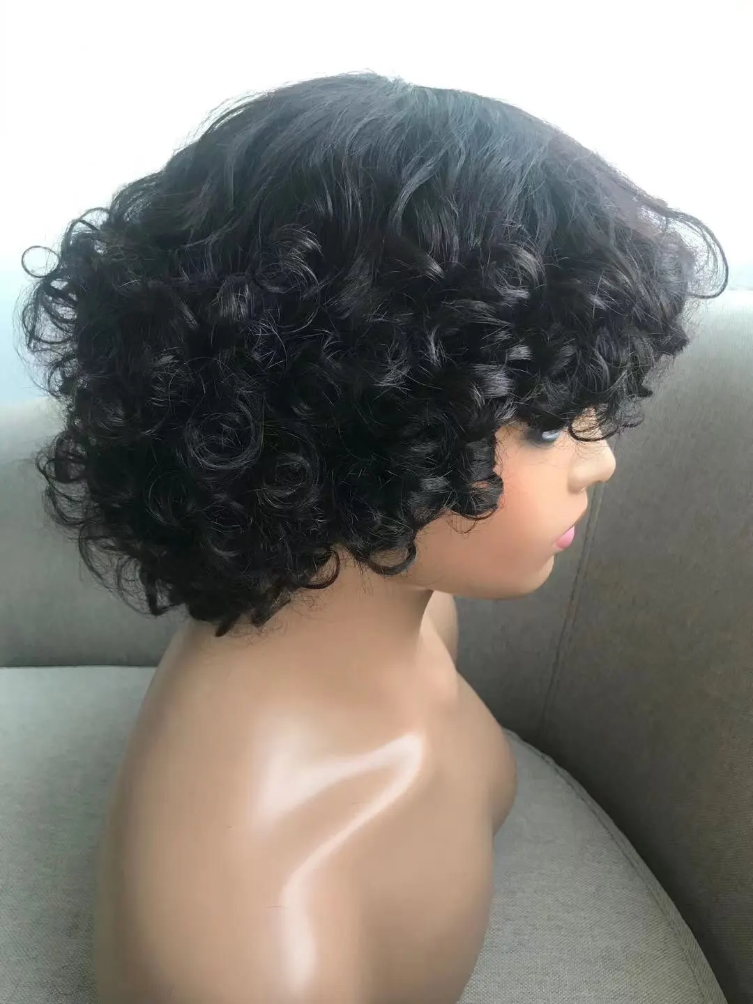 Свободные вьющиеся человеческие волосы, парики с челкой, бразильские неповрежденные короткие вьющиеся волосы, парики для женщин, спиральные Надувные вьющиеся парики
