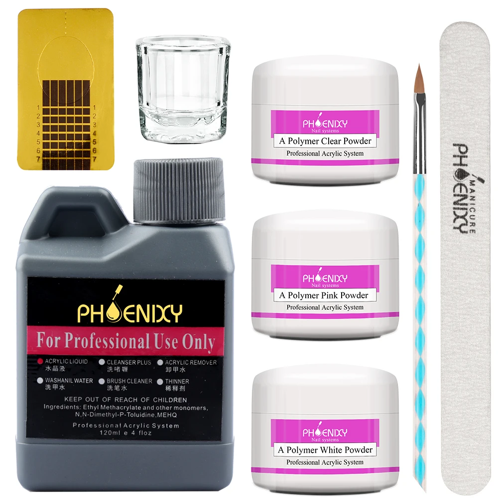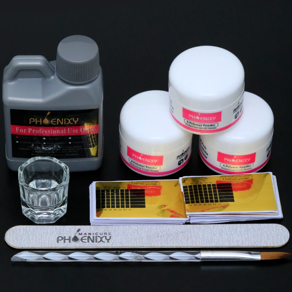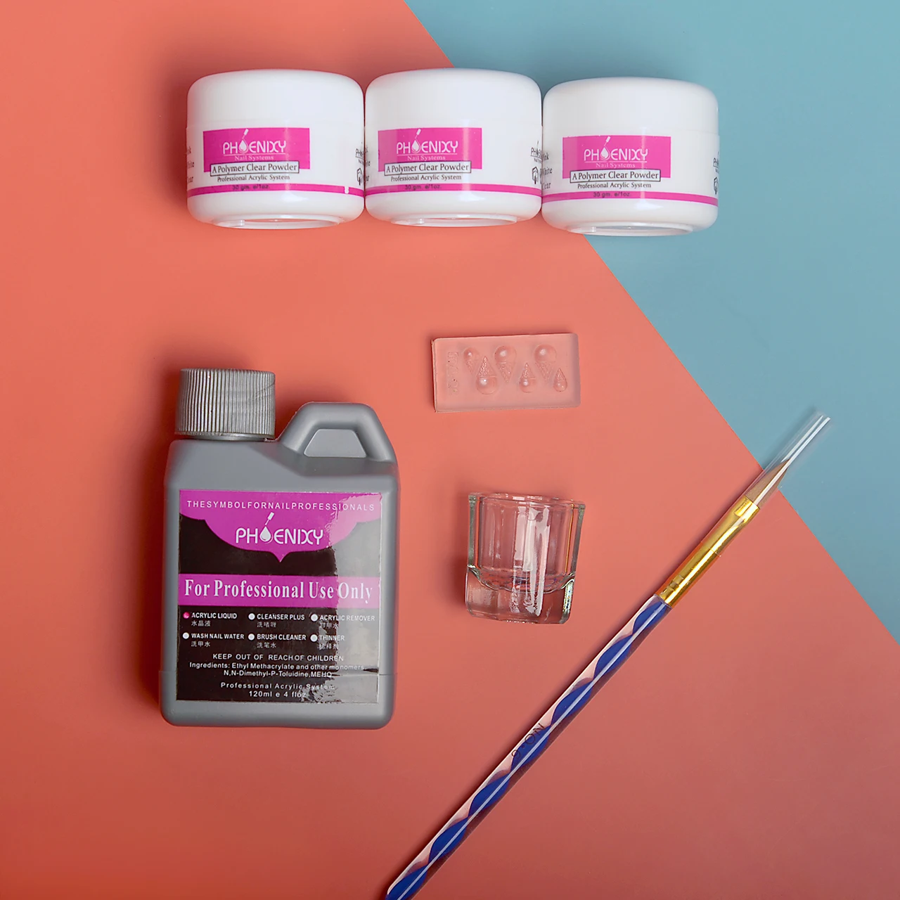1 х Белый акриловый порошок1 х розовый акриловый порошок1 прозрачная акриловая пудра1 Акриловая жидкость 120 мл1 акриловая кисть для ногтейСтеклянная чашка-1 шт.1X20 шт. Форма для ногтей1 х серая пилка для ногтей