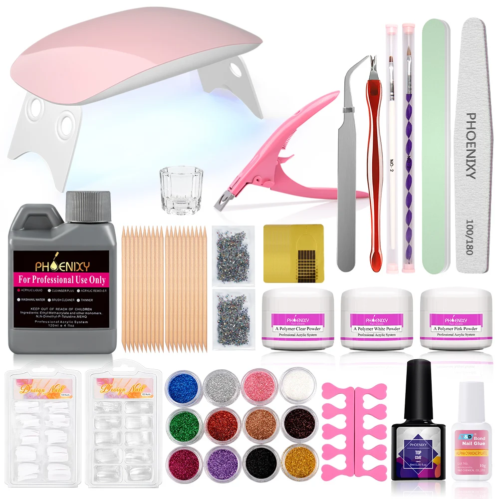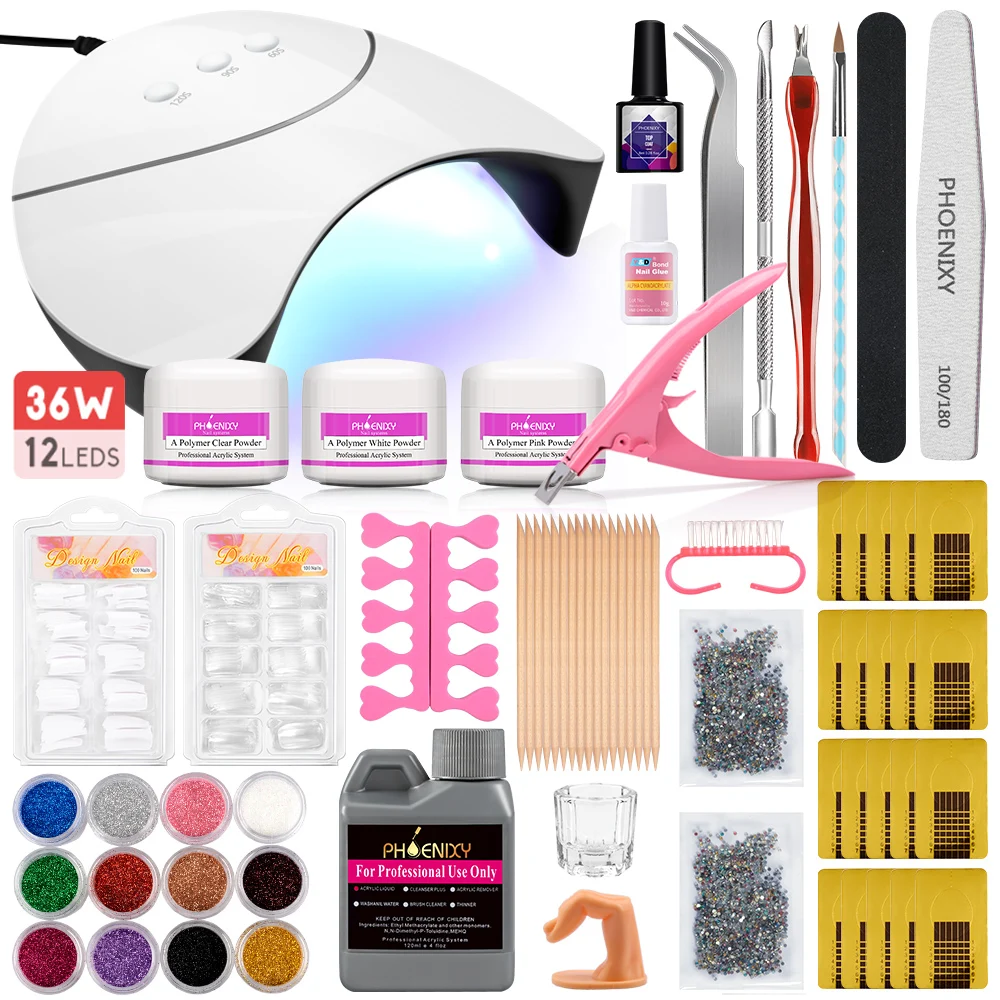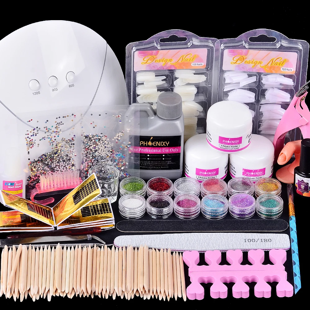 1X36W УФ светодиодный светильник1 х Белый акриловый порошок1 х розовый акриловый порошок1 прозрачная акриловая пудра1 Акриловая жидкость 120 мл1 базовое пальто 8 мл1 акриловая кисть для ногтей1 X поддельный палец1 X машинка для стрижки ногтей1 Изогнутый пинцет1X100 шт деревянная палка1 X вилочка для маникюра1 X толкатель для ногтей1 X щетка для ногтейСтеклянная чашка-1 шт.1X20 шт. Форма для ногтей1X1 пара разделителей пальцев1X100 шт французские кончики для ногтей1X100 шт Натуральные Цветные ногти2 пилки для ногтей2X2000 шт Стразы1X10 г клей для ногтей1X12 шт темные блестящие порошки