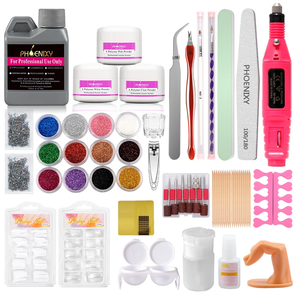 1 х Белый акриловый порошок1 х розовый акриловый порошок1 прозрачная акриловая пудра1 Акриловая жидкость 120 мл1 X USB мини-дрель для ногтей1 X коробка для стерилизации инструментов для дизайна ногтей1 X поддельный палец1X10 г клей для ногтей1X1 пара разделителей пальцев1 X жидкий насос для удаления ногтейСтеклянная чашка-1 шт.20X1 шт Wooder Stick1 Изогнутый пинцет1 X вилочка для маникюра1 X УФ-щетка для ногтей1 акриловая кисть для ногтей1X100 шт французские кончики для ногтей1X100 шт прозрачные ногти1 X машинка для стрижки ногтей2X2000 шт Стразы1X12 шт темные блестящие порошки2 пилки для ногтей1X20 шт. Форма для ногтей