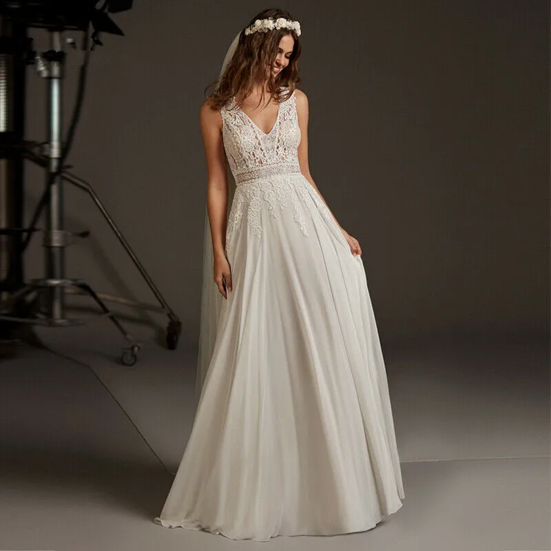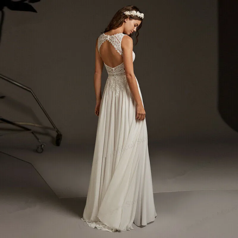Шифоновое пляжное свадебное платье в стиле бохо, ТРАПЕЦИЕВИДНОЕ кружевное длинное платье невесты без рукавов, с V-образным вырезом, открытой спиной и без шлейфа, в пол
