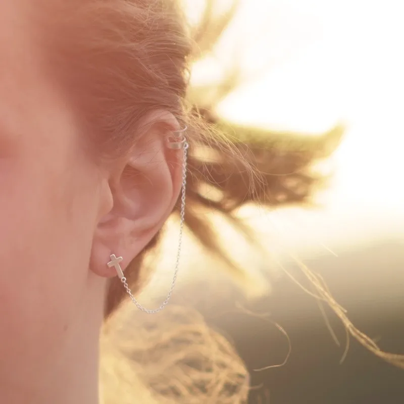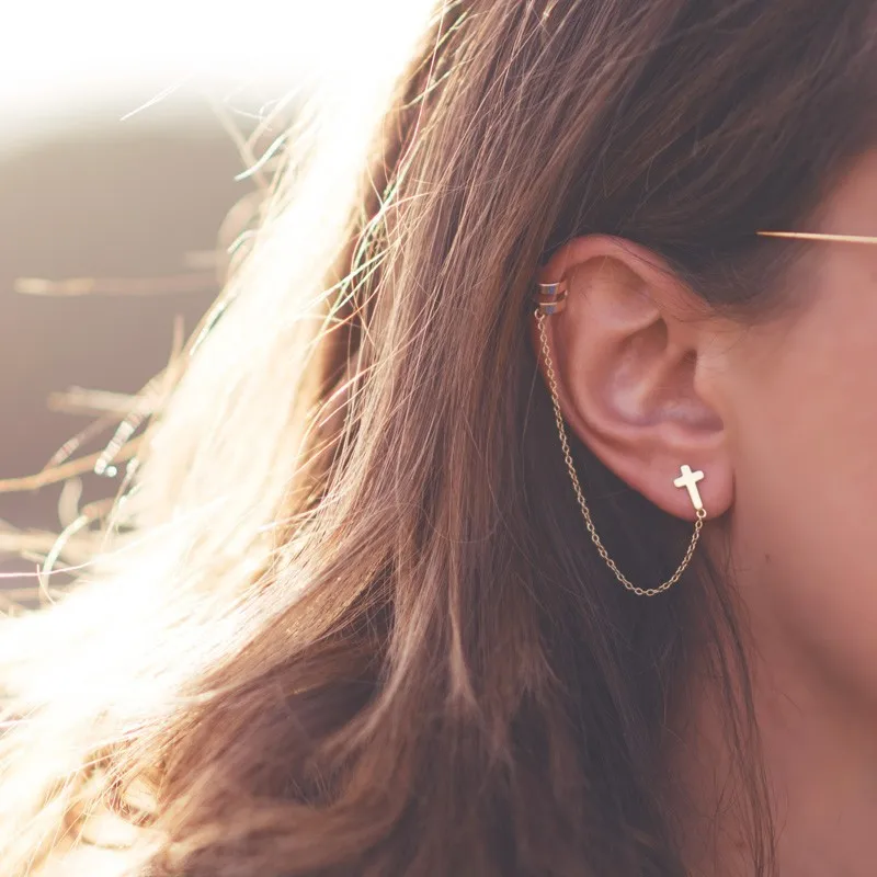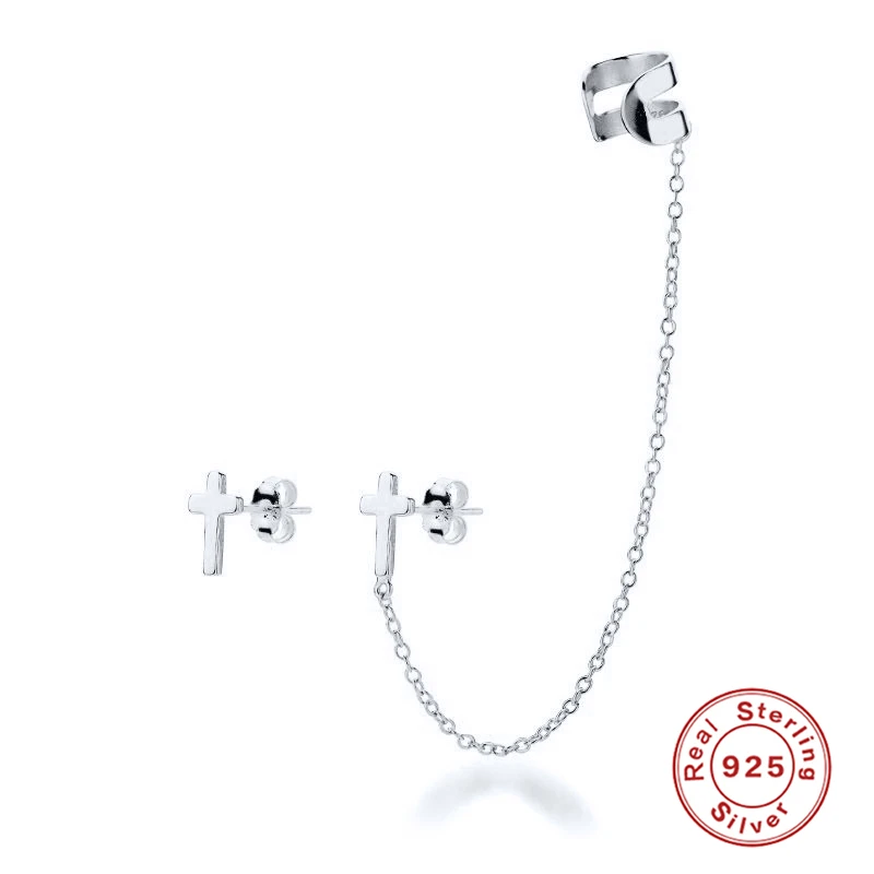 Асимметричные серьги-гвоздики из стерлингового серебра 925 пробы с крестом для женщин и девушек крутые Серьги-кисточки в стиле панк с цепочкой ювелирные изделия подарок
