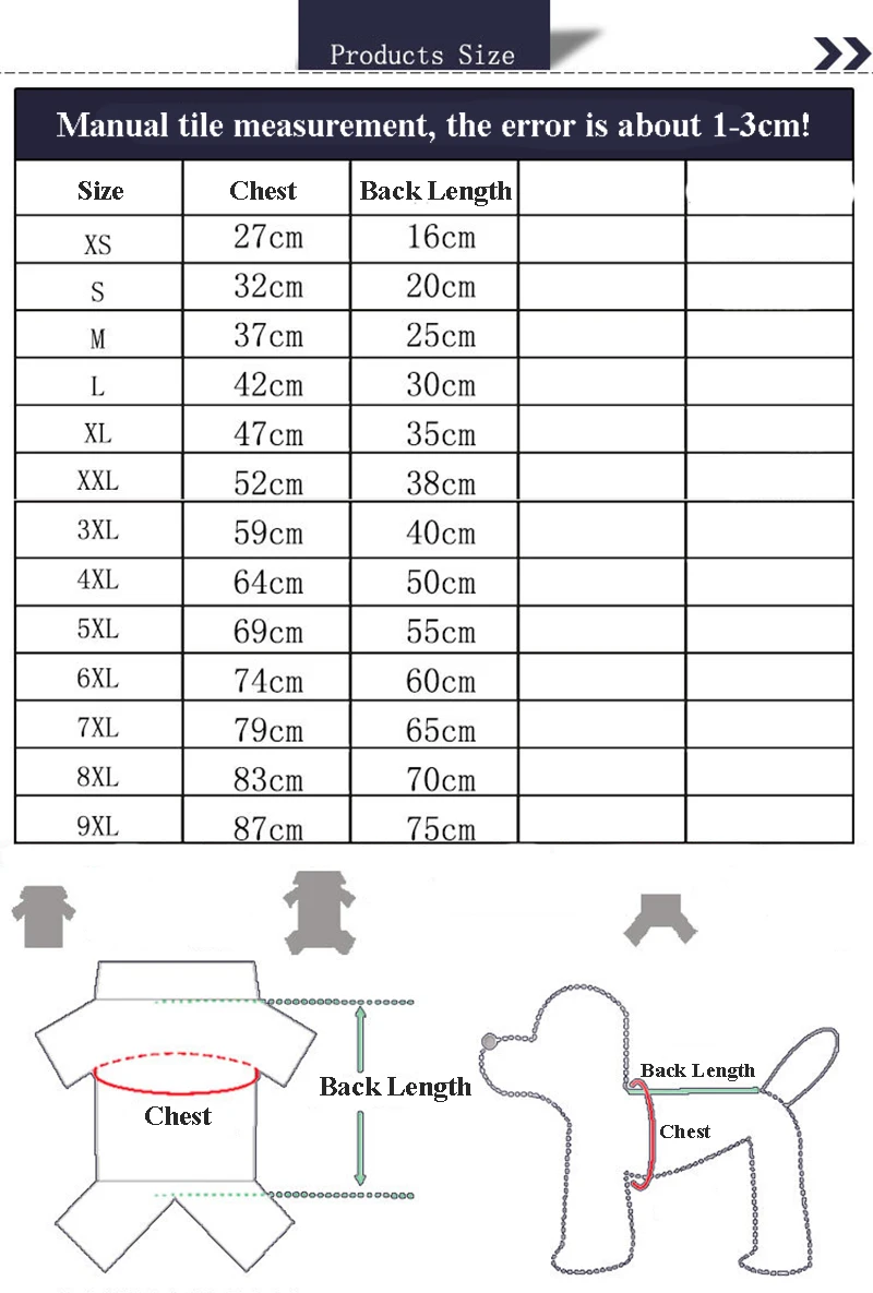 XS (домашних животных в пределах 0,5-1 кг) S (домашних животных в пределах 1,5-2,5 кг) M (домашних животных в пределах 2,5-3,5 кг) L (Домашние животные в пределах 3-4 кг) XL (Домашние животные в пределах 4-5 кг) XXL (Домашние животные в пределах 5-6 кг) 3XL (Домашние животные в пределах 6-7 кг) 4XL (Домашние животные в пределах 7-10 кг) 5XL (Домашние животные в пределах 10-17 кг) 6XL (Домашние животные в пределах 17-25 кг) 7XL (Домашние животные в пределах 25-30 кг) 8XL (Домашние животные в пределах 30-35 кг) 9XL (Домашние животные в пределах 35-45 кг) Обратите внимание: рекомендации по весу только для справки, пожалуйста, выберите соответствующий размер одежды в соответствии с фактическим размером собаки