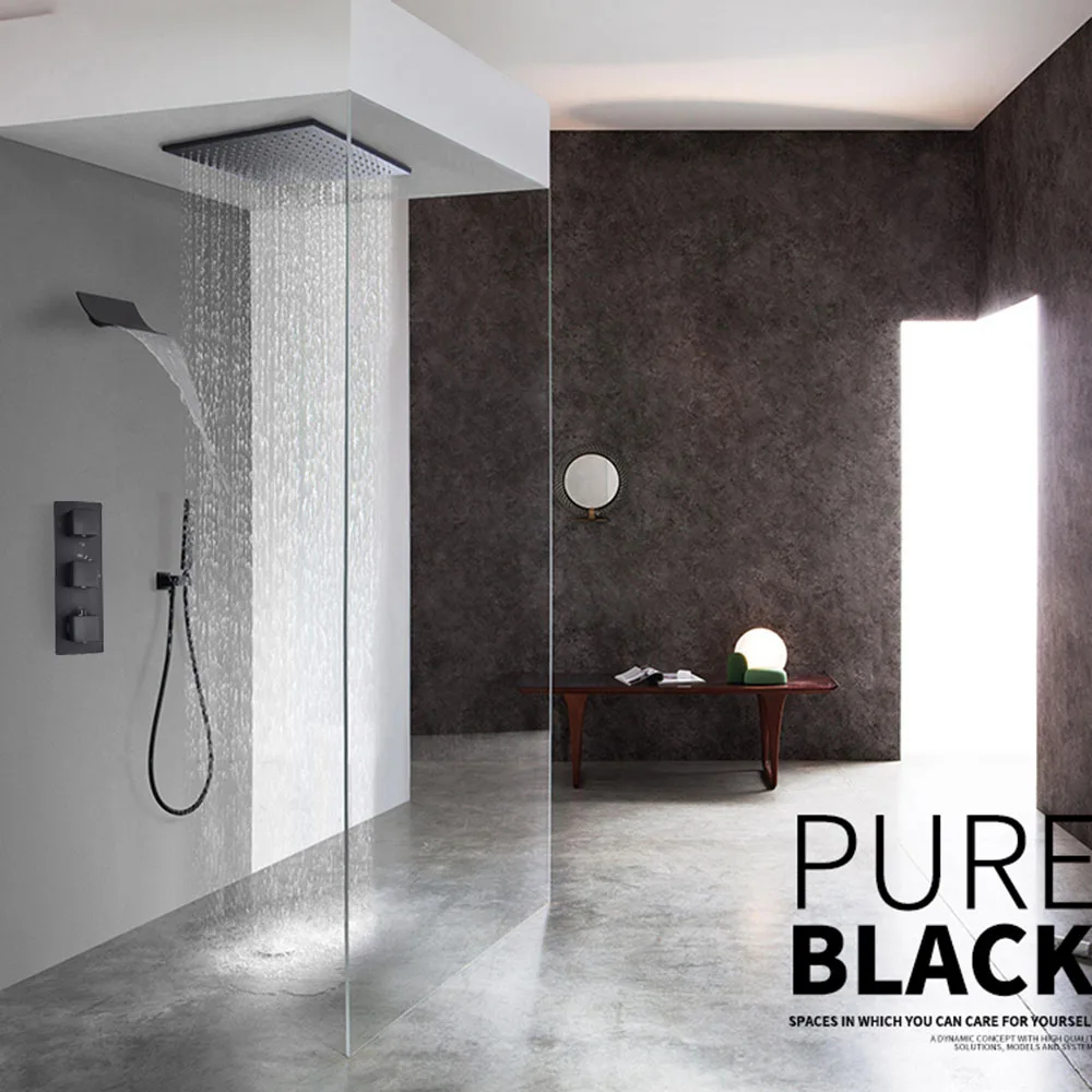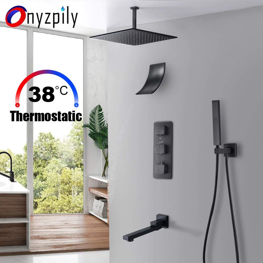 Onyzpily матовый черный термостатический водопад Ванная комната душевой кран Набор потолочный Душ Системы 4-полосная смеситель настенный Mounte