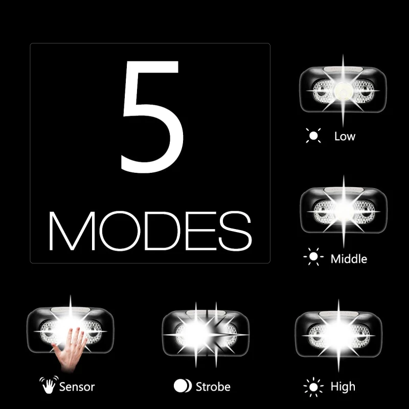 Портативный наружный Индуктивный светильник имеет перспективный дизайн, зарядка через USB-порт увеличивает мощность. Специальная конструкция двойного переключения для преобразования режимов. Аккумуляторная батарея высокой емкости обеспечивает длительное питание для более безопасных занятий спортом на открытом воздухе. Налобный фонарь в основном используется для рыбалки, охоты, ночного бега, туризма и кемпинга.1. Индукционная фара на палец, когда ваша рука находится рядом с фарой в пределах 15 см, фара включается, когда вы пальцем оставите фару, она будет выключена.2. Фара содержит аккумулятор. Вы можете использовать зарядный USB-кабель для фары.3. Имеет два переключателя, нажимной переключатель и Индуктивный переключатель.4 режима нажатия на переключатель: высокий/средний/низкий/мигающий (нажмите и удерживайте 2 секунды, чтобы войти в мигание)1-Режимы для индуктивного выключателя: высосветильникСпецификация:Может использоваться как фараС регулируемым оголовьем вы можете использовать более комфортноЛегко и удобно наносится и снимаетсяЕго можно использовать для дождя, но нельзя использовать для дайвинга.Питание: В комплект входит аккумулятор