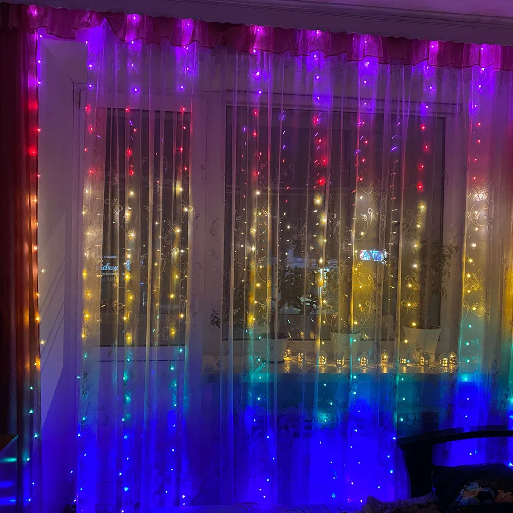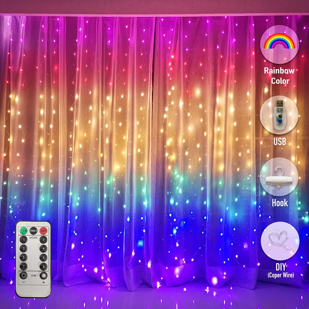 Светодиодная Радужная Гирлянда-занавеска, 3 м, 5 В, USB, Рождественская сказочная гирлянда с крючками, праздничное украшение для стены, спальни, окна