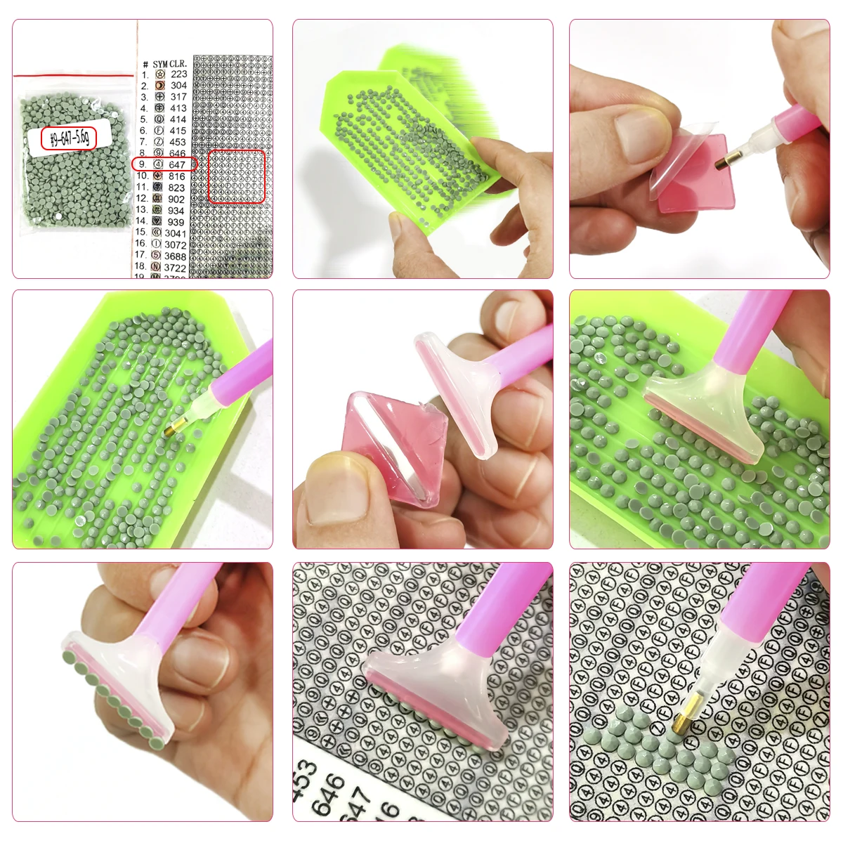 1. См. Таблицу сравнения на холсте, чтобы определить каждый номер алмаза и соответствующий номер печати на холсте.2. Вставьте круглый конец ручки в Дозирующий цемент (нажмите, чтобы сохранить цемент на месте).3. Используйте круглый конец ручки, чтобы приклеить бриллиант и слегка нажмите, чтобы удалить любой дополнительный цемент.4. Разорвите частичную пленку и поместите алмаз на холст в соответствии с соответствующим номером.6. После завершения слегка прижмите алмазы рукой или книгой, чтобы убедиться, что алмазы надежно закреплены.