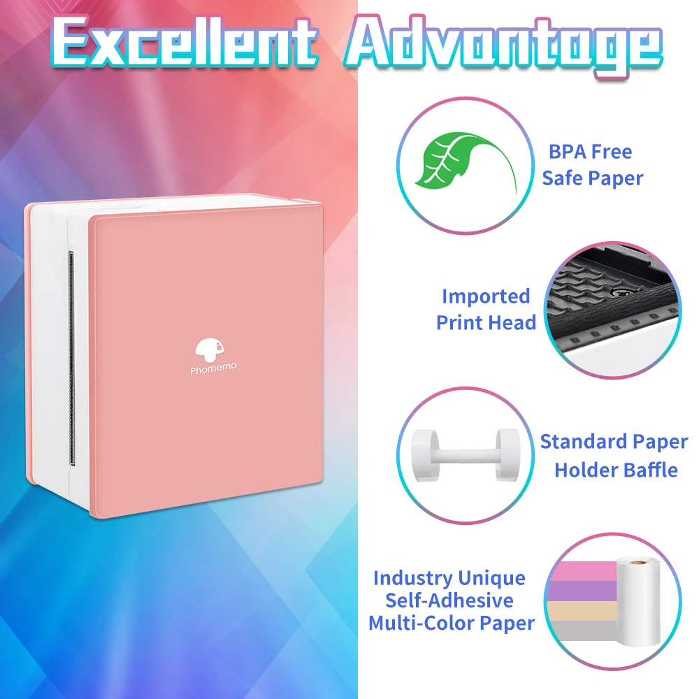 Портативный принтер Phomemo M02, устройство для изготовления фотографий, клейкая бумага без чернил, термальная цветная бумага, рулоны текста, QR-код, принтер для наклеек