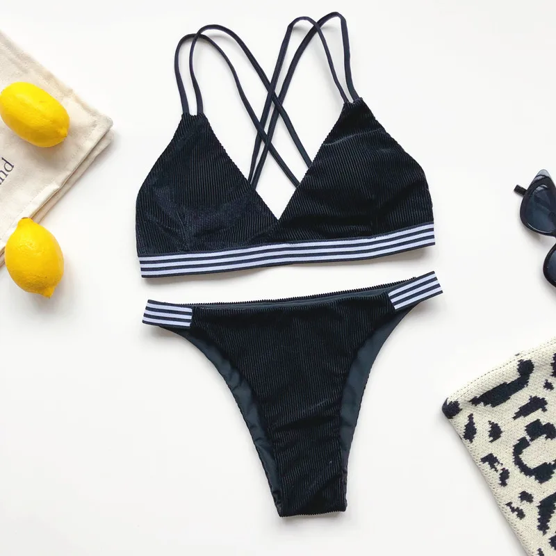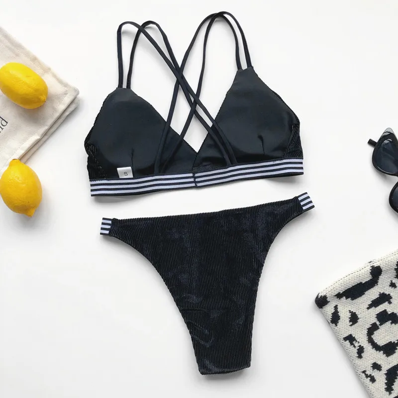 Сексуальный купальник, Женский однотонный черный бандажный бюстгальтер на шнуровке с вырезами, бикини для девушек, полосатые ванны, купальный костюм, стринги, купальник, бикини