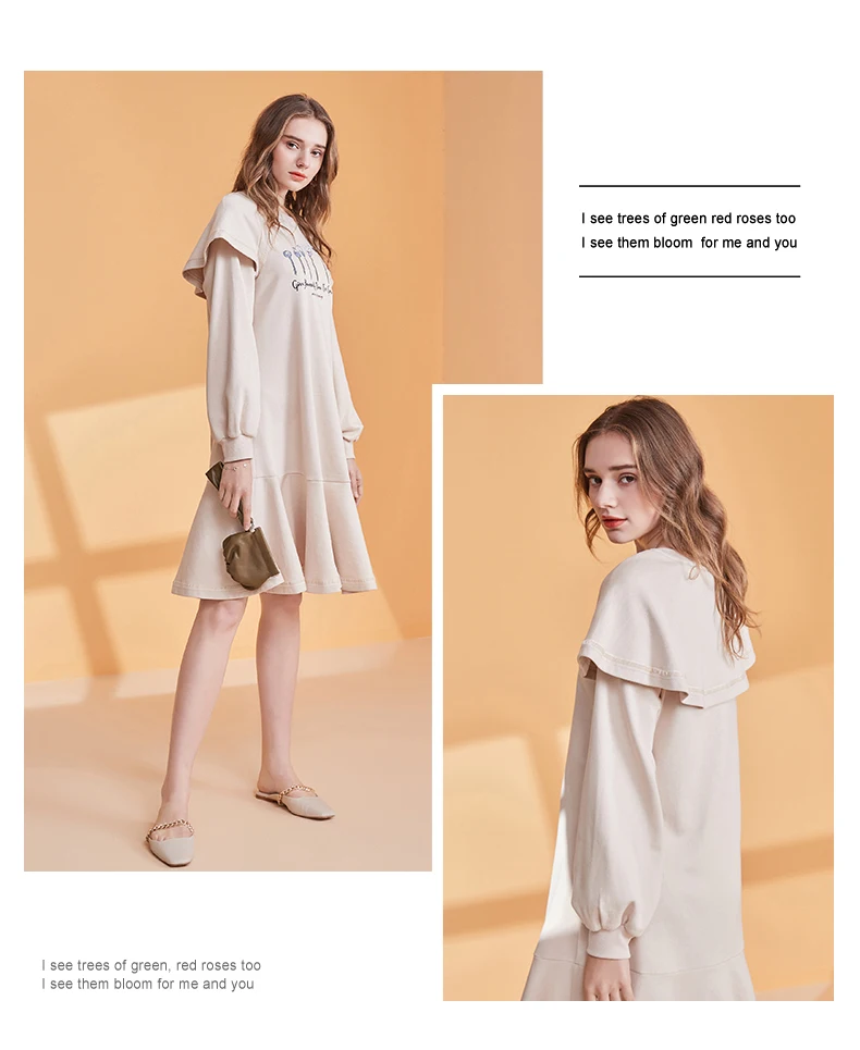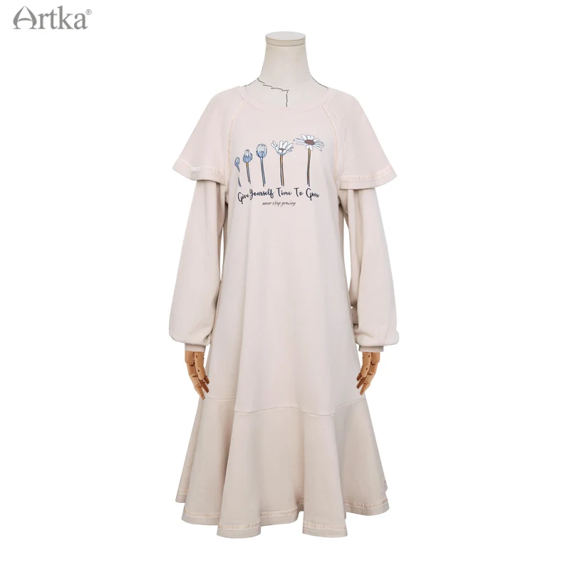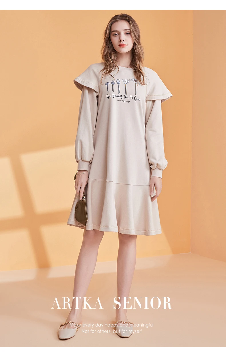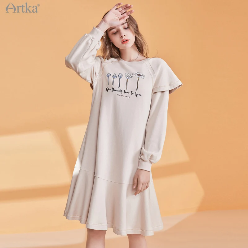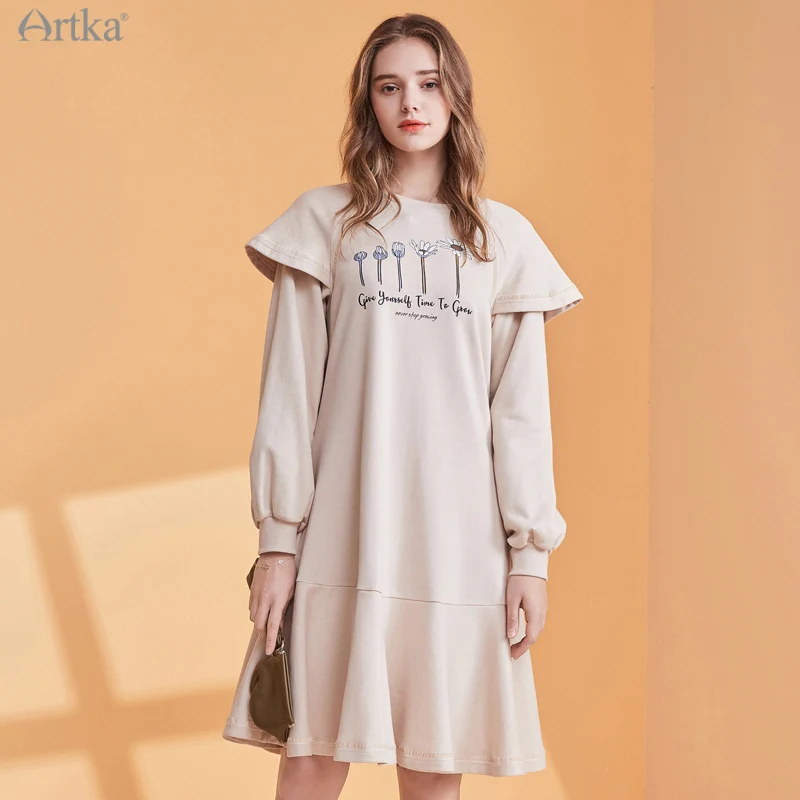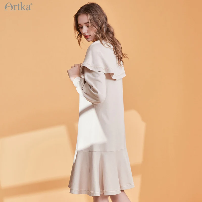 ARTKA 2021 Весна новое женское платье модные повседневные накидка дизайн платья с длинным рукавом, о-образным вырезом, свободные спортивные свитера с рюшами платье ZA25019C