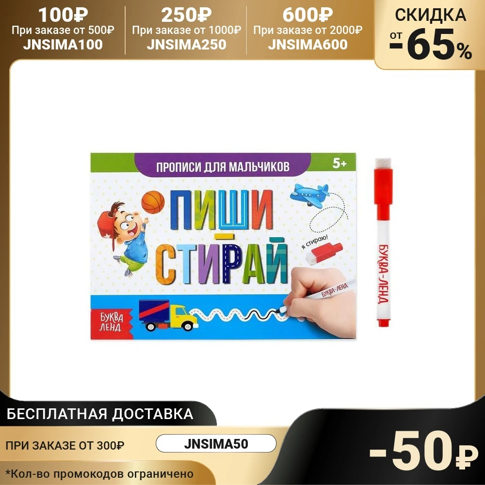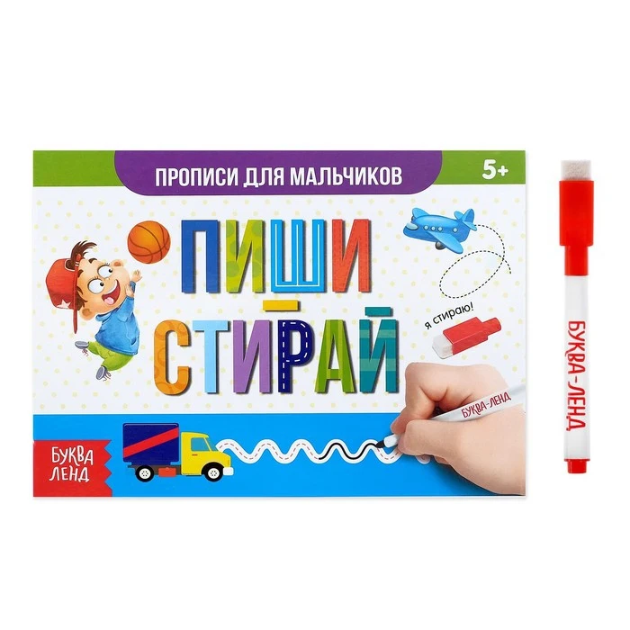 Многоразовая книжка с маркером «Пиши-стирай. Прописи для мальчиков», 12 стр.