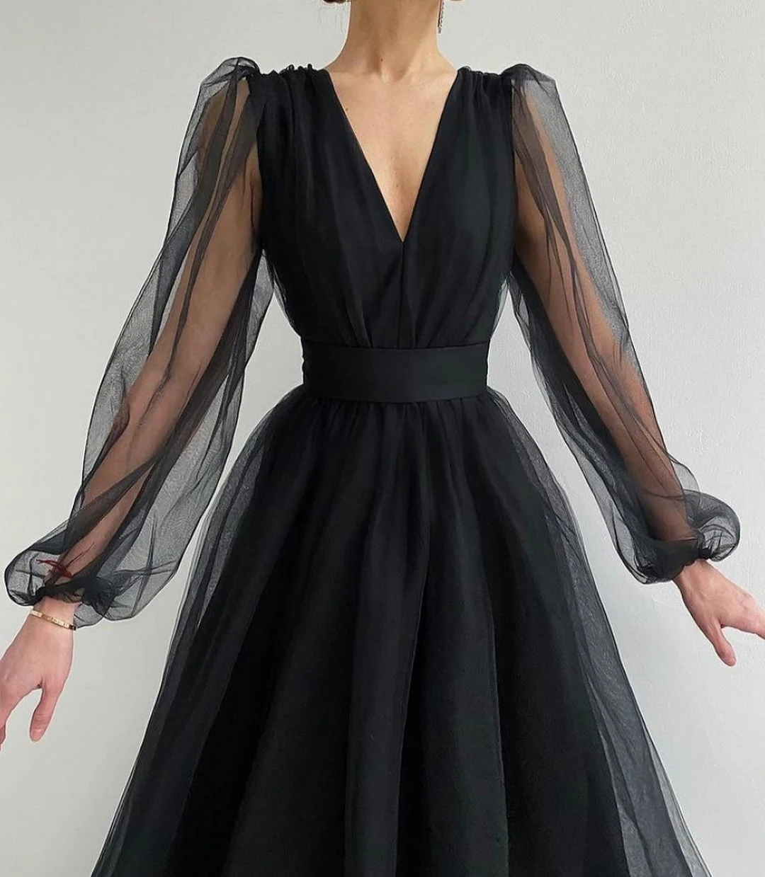 Женское вечернее платье из тюля, черное винтажное платье с длинным рукавом, V-образным вырезом, молнией на спине