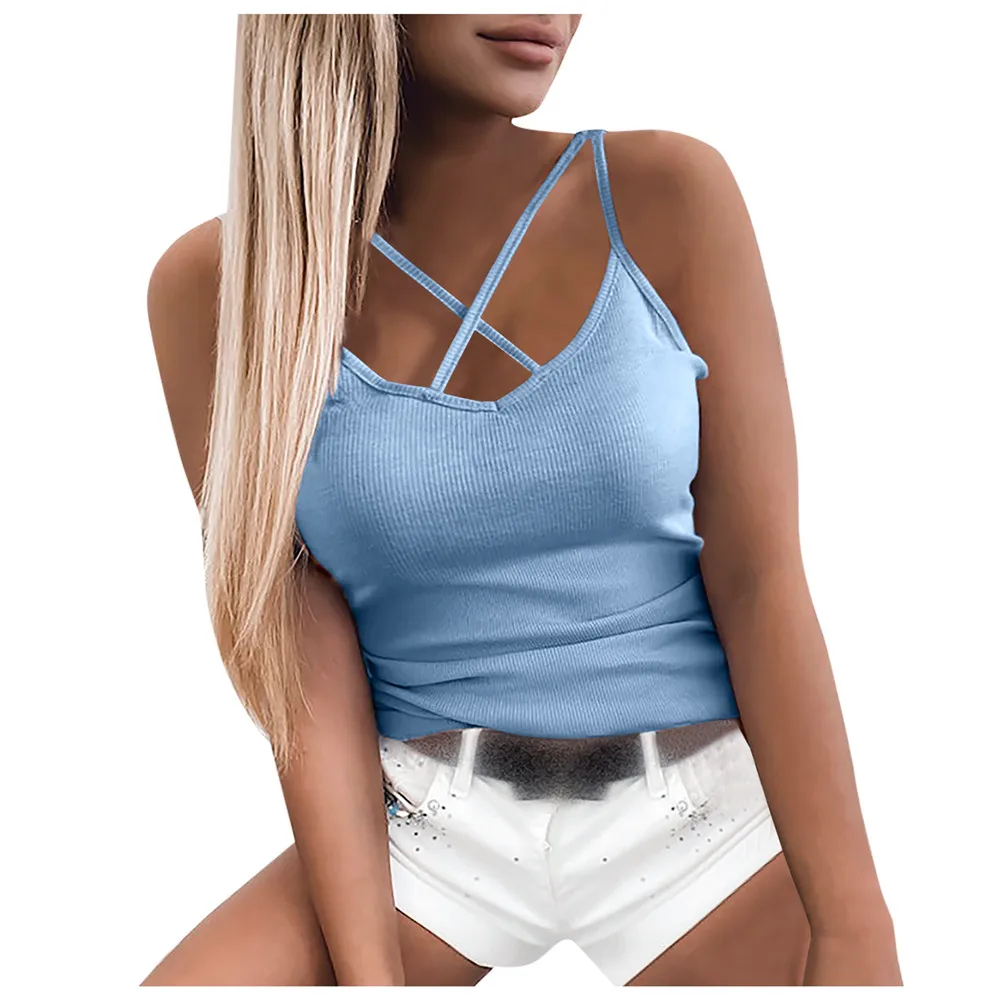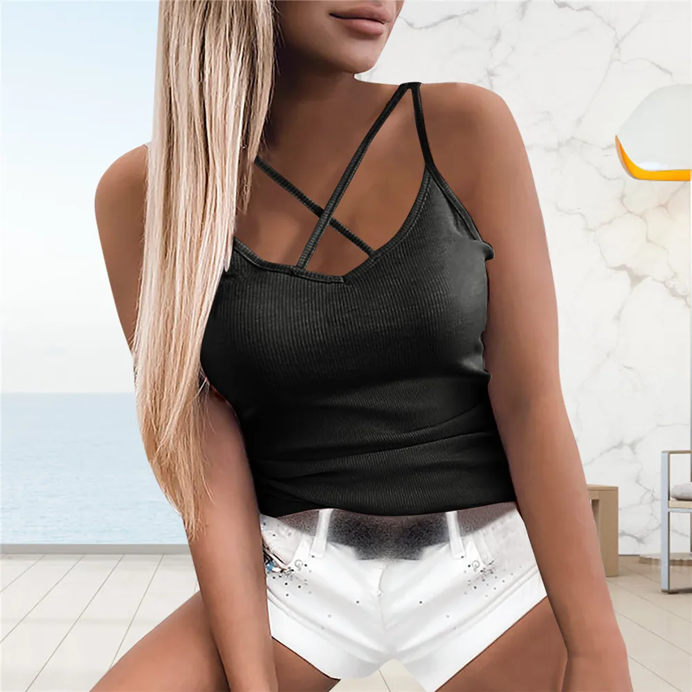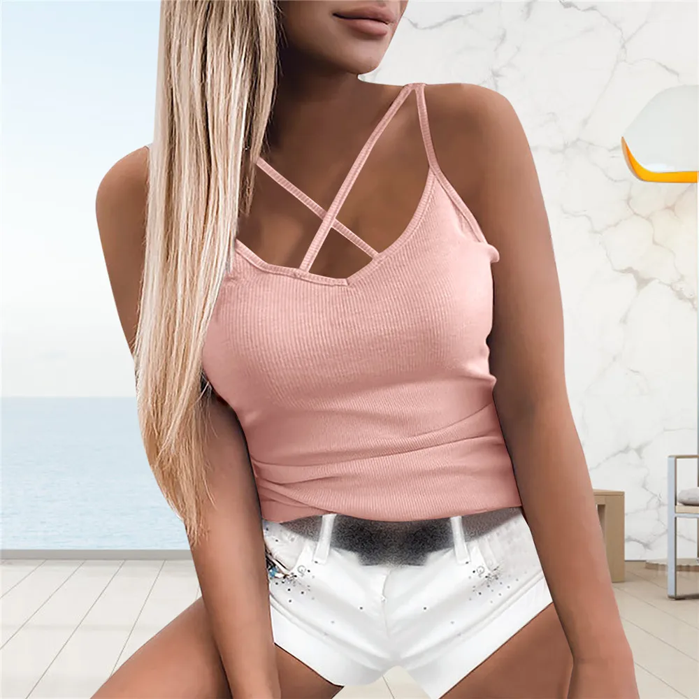 Женский Повседневный пуловер, трикотажный топ с перекрестными бретелями, облегающий Топ без рукавов с V-образным вырезом, черный, красный, розовый, белый, синий цвета, на лето