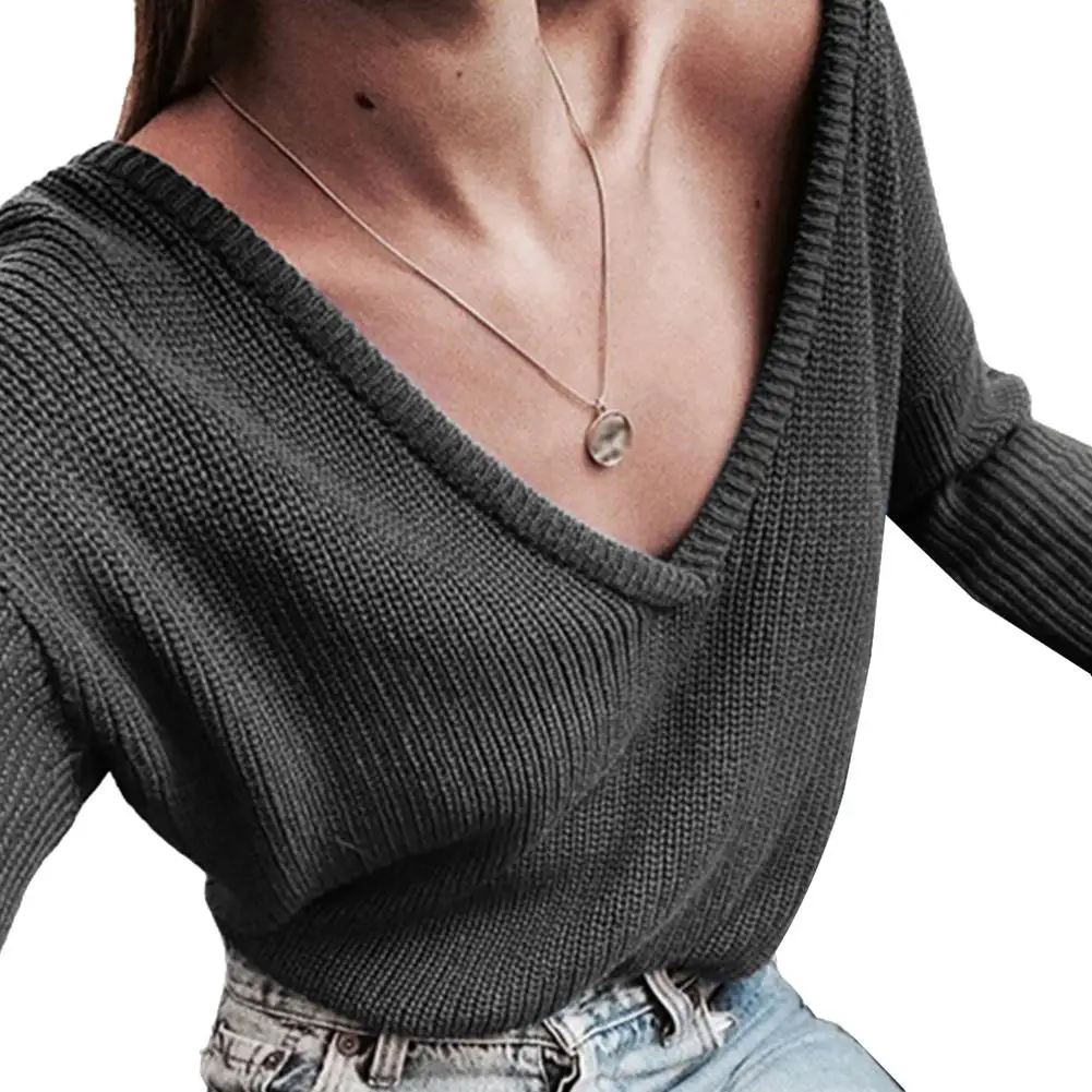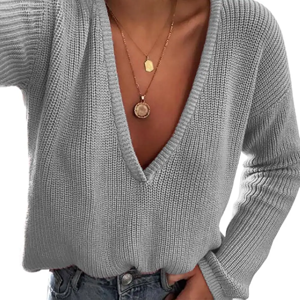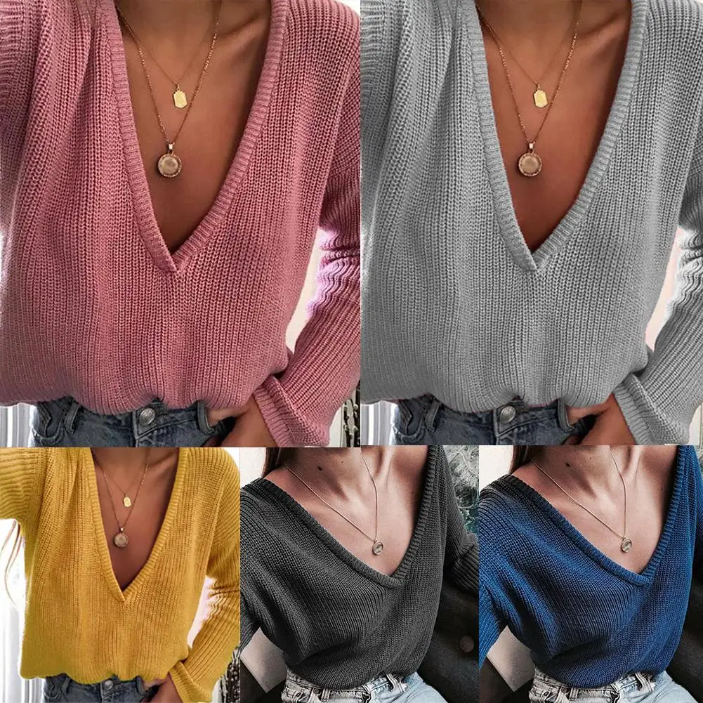 Женский однотонный Свободный вязаный свитер, повседневный джемпер с глубоким V-образным вырезом и длинным рукавом, пуловер на осень и зиму