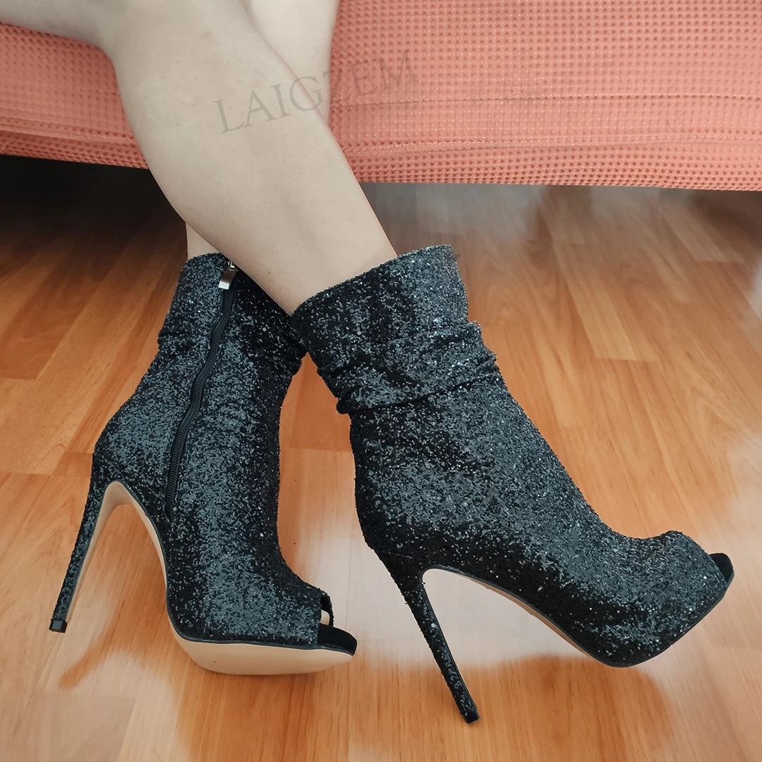 Женские ботинки на шнуровке LAIGZEM, черные ботинки с открытым носком, на молнии, на каблуке, с блестками, большие размеры 41, 42, 47