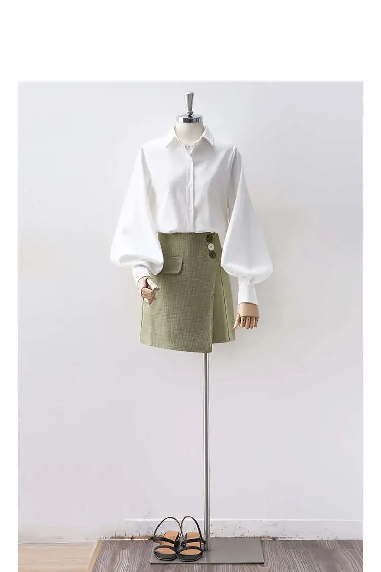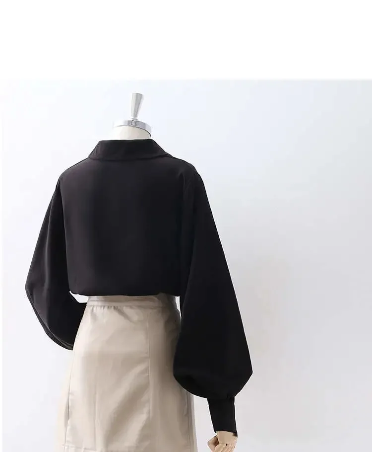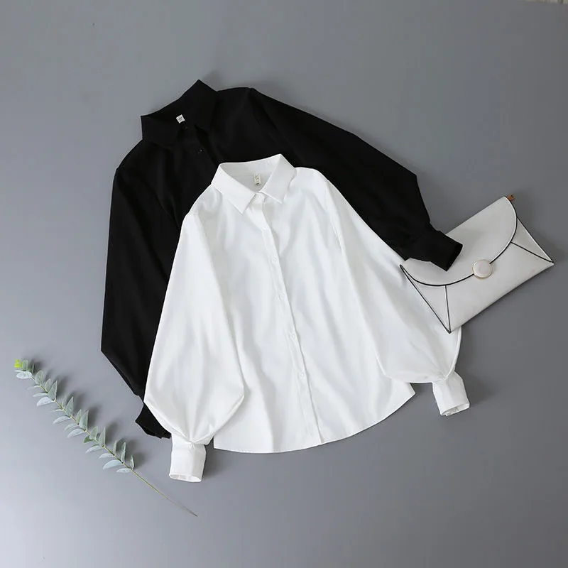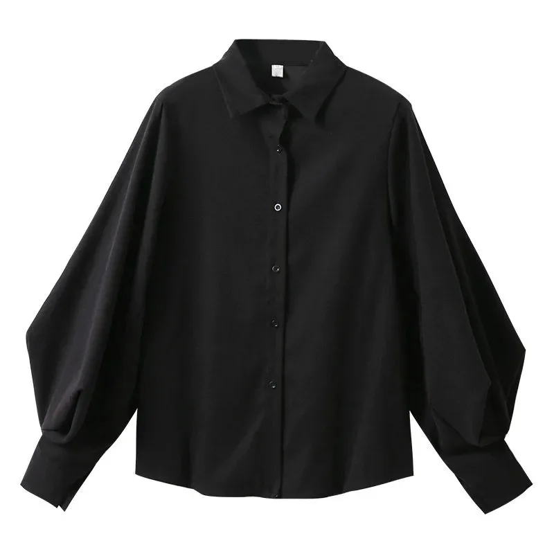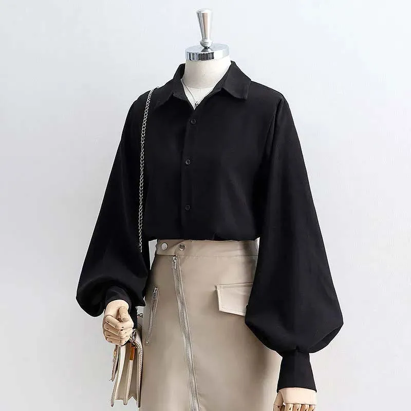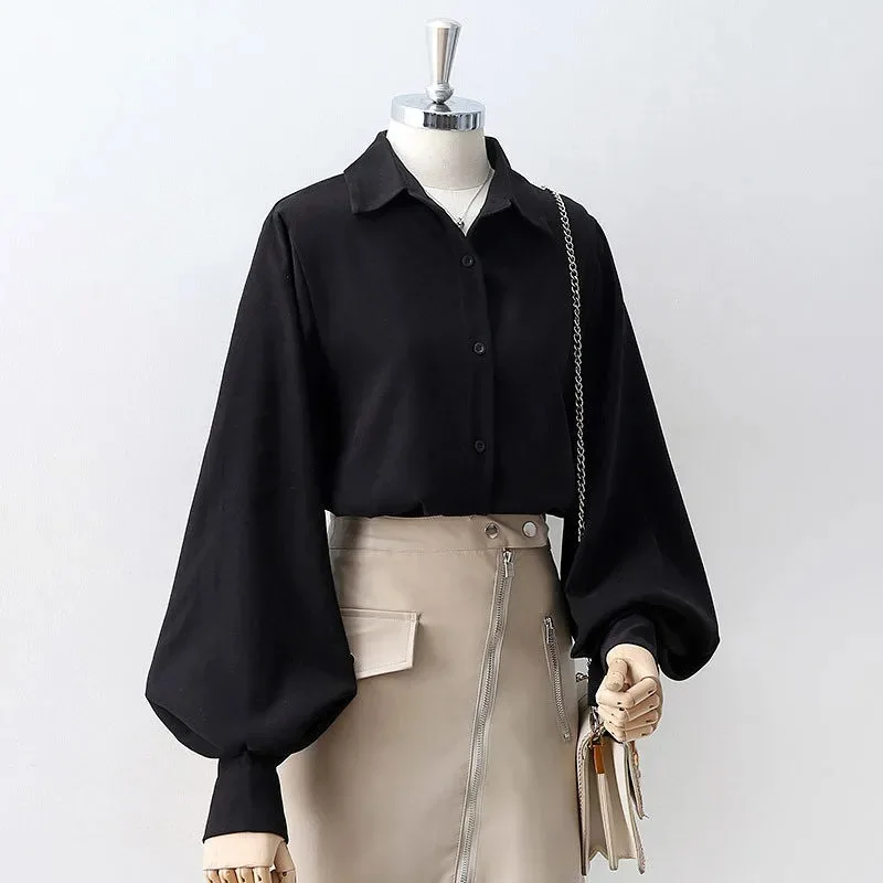 Женская блузка с рукавами-фонариками, Повседневная Свободная Однотонная рубашка с отложным воротником, на пуговицах, модель F126 на весну, 2021