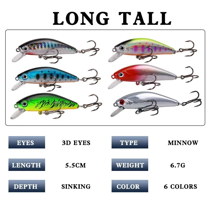 3D глаза делают его идеальным инструментом для любителей рыбалки.Красочное тело позволяет легко ловить рыбу.Реалистичное и быстрое действие в воде.Отличный визуальный эффект заманивания рыбы. Информация о продукте:Бренд: YuQinМодель: Приманка MinnowТип приманки: жесткая рыболовная приманкаЦвета: 6 цветовВес: 6,7 гДлина: 5,5 смМатериал: АБС-пластикГлаза: 3D рыбий глазГлубина погружения: 0,1-1,5 мКрючки: Высокоуглеродистая сталь тройные Крючки для плаванияПосылка: OPP bag Примечание:Размер для ручного измерения, может быть погрешность от 0 до 1 см, относится к нормальному явлениюИз-за разницы между различными мониторами изображение может не отражать фактический цвет изделия. Спасибо!