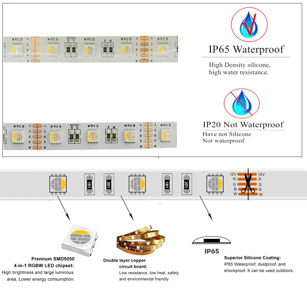 1. Модель чипа: SMD 50502. Излучает: RGBW RGBWW3. Степень защиты: IP20 не водонепроницаемый/IP65 водонепроницаемый4. Рабочее напряжение: 12 В постоянного тока5. Светодиодный объем: 60 светодиодный s/m 30 светодиодный s/m, 5 метров/рулон6. Угол обзора: 120 ° ~ 140 °7. Рабочая температура: от-20 до 50 °.9. Класс водонепроницаемости: IP20 / IP6510. Источник питания: 5 м 12 В/3 А 10 м 12 В 5A