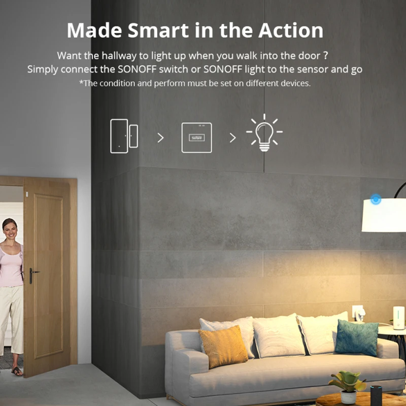 Что еще более важно, Датчик позволяет добавить или старый смартфон, чтобы посмотреть, кто входит в ваш дом, предоставляя вам более подробную информацию и примечания о неприглашенных гостях. Можно синхронизировать состояние открытия и закрытия двери/окна в приложение, которое дает вам душевное спокойствие, когда вы не дома. Проверка истории может быть отслежена до последних 3 месяцев, и это может помочь вам посмотреть назад и проверить состояние вашего дома в то время. Свет срабатывает в действии. Вы можете установить связь в умной сцене приложения eWeLink, чтобы подключить датчик и ваш светильник, чтобы вы могли открыть или закрыть дверь, чтобы включить и выключить светильник коридора. Требуется для того, чтобы сделать эту связь возможной. В сочетании с сервисом IFTTT датчик может использоваться для запуска большего количества устройств или процедур. Эта функция «совместного использования устройств» предназначена для того, чтобы дать больше вашей семье знать, что ваш дом безопасен. После обмена сенсором, все общие пользователи получат оповещение о состоянии, когда кто-то откроет дверь. Датчик установлен на клейкой основе, легко перемещается и снимается. Он может работать просто хорошо вверх дном и боком, пока магнит находится менее 5 мм от датчика, что не влияет на расположение датчика. Он работает от батареи и имеет низкое энергопотребление, что обеспечивает Срок службы батареи может длиться до 2 лет.