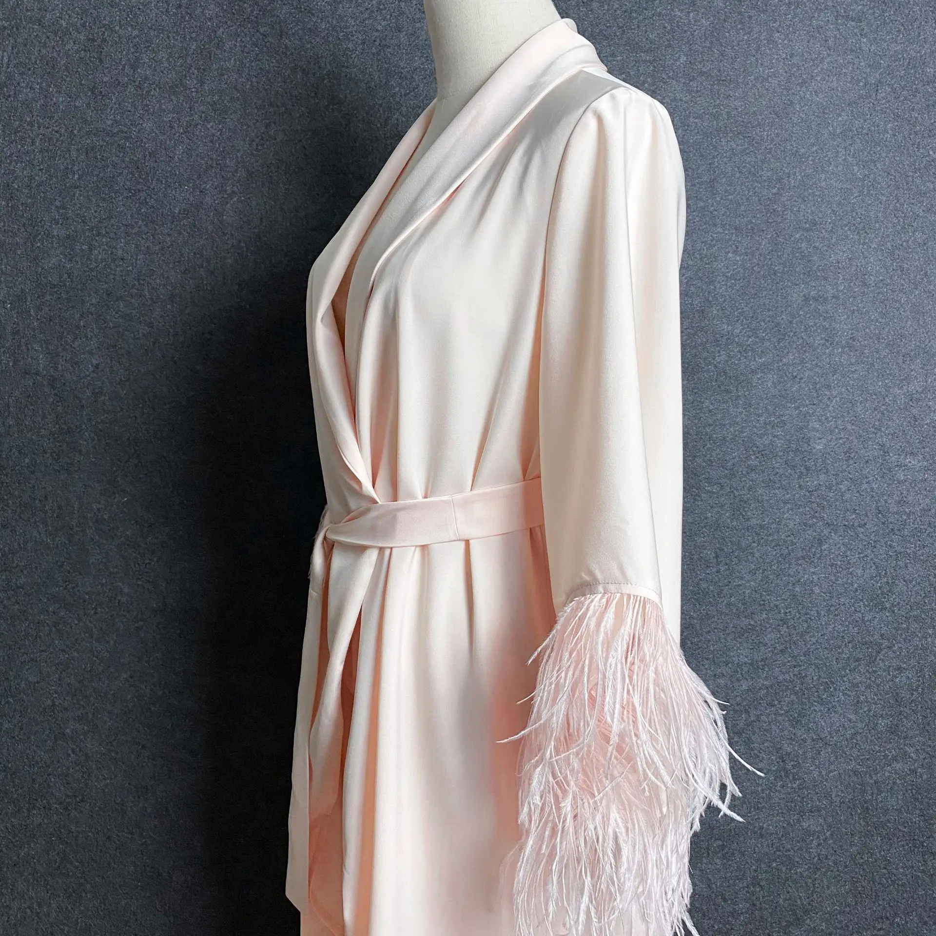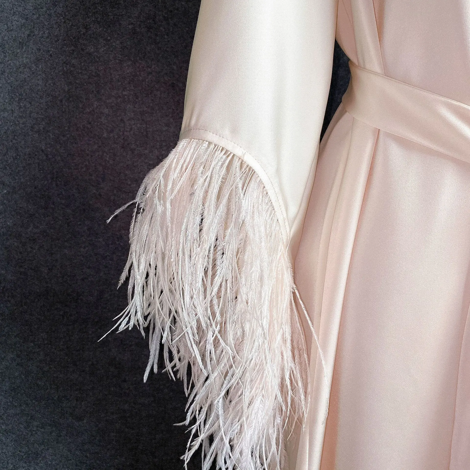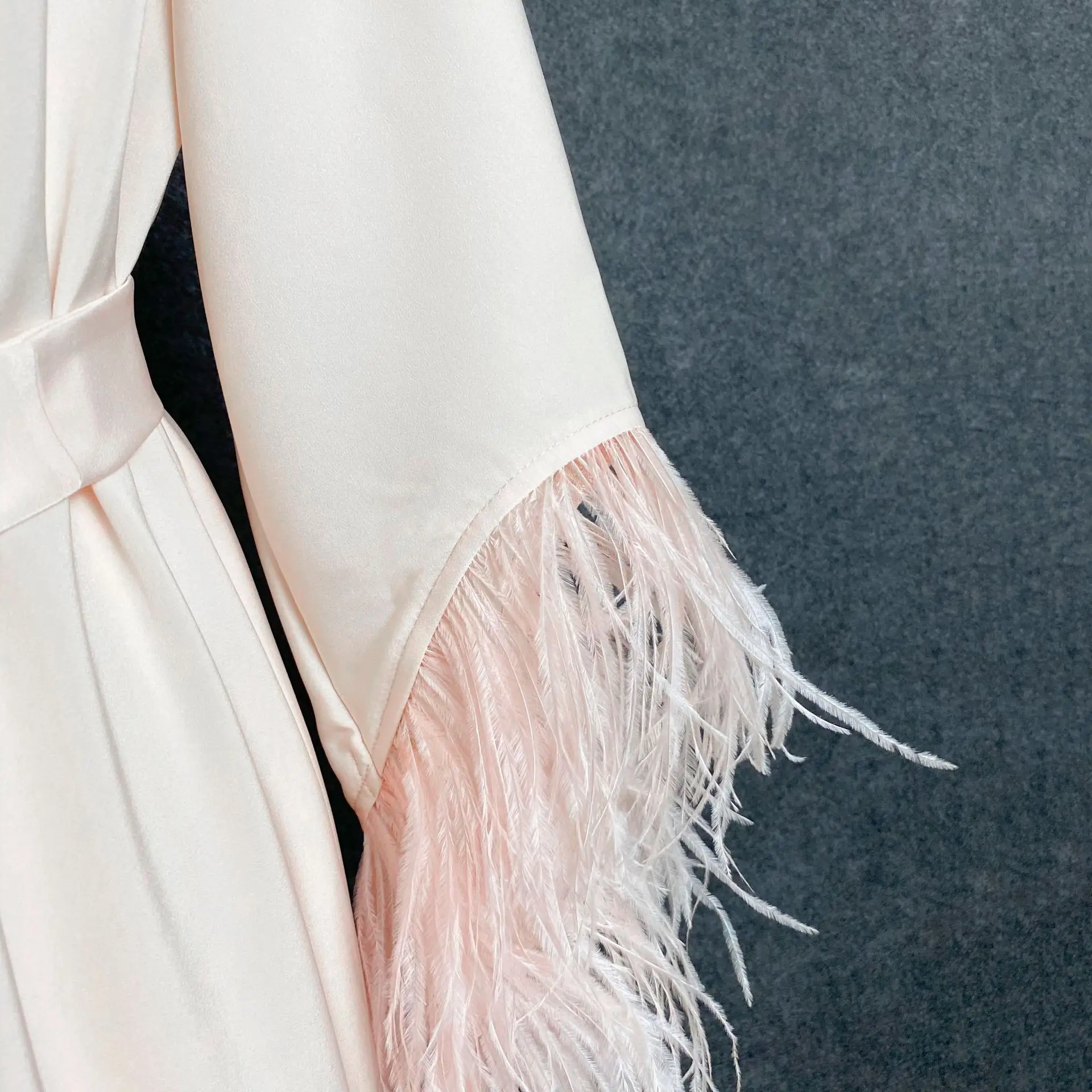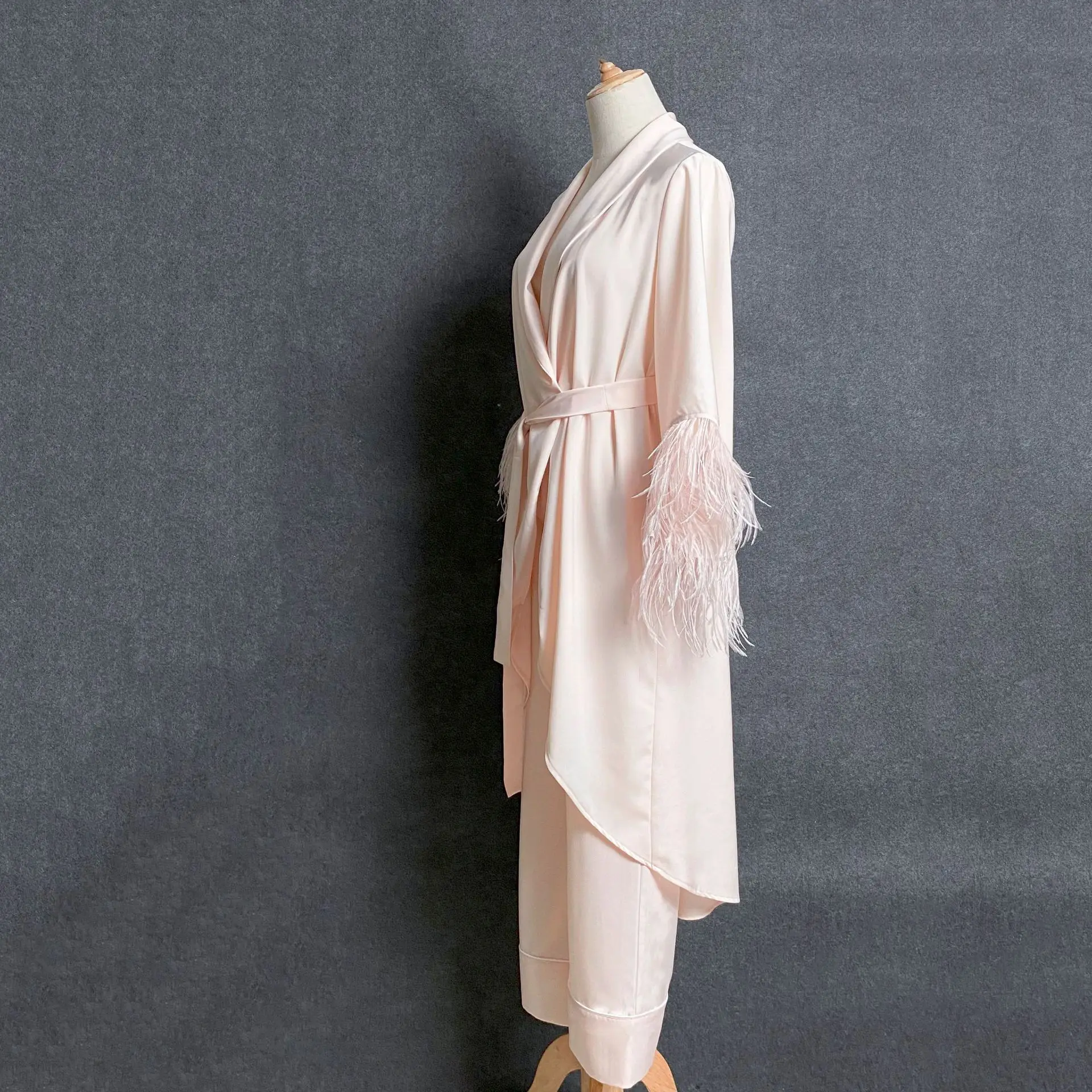 Пижама женская шелковая, пикантная одежда для сна, размера плюс, халаты с перьями и штаны, комплект одежды для дома с длинным рукавом, плотный теплый домашний костюм
