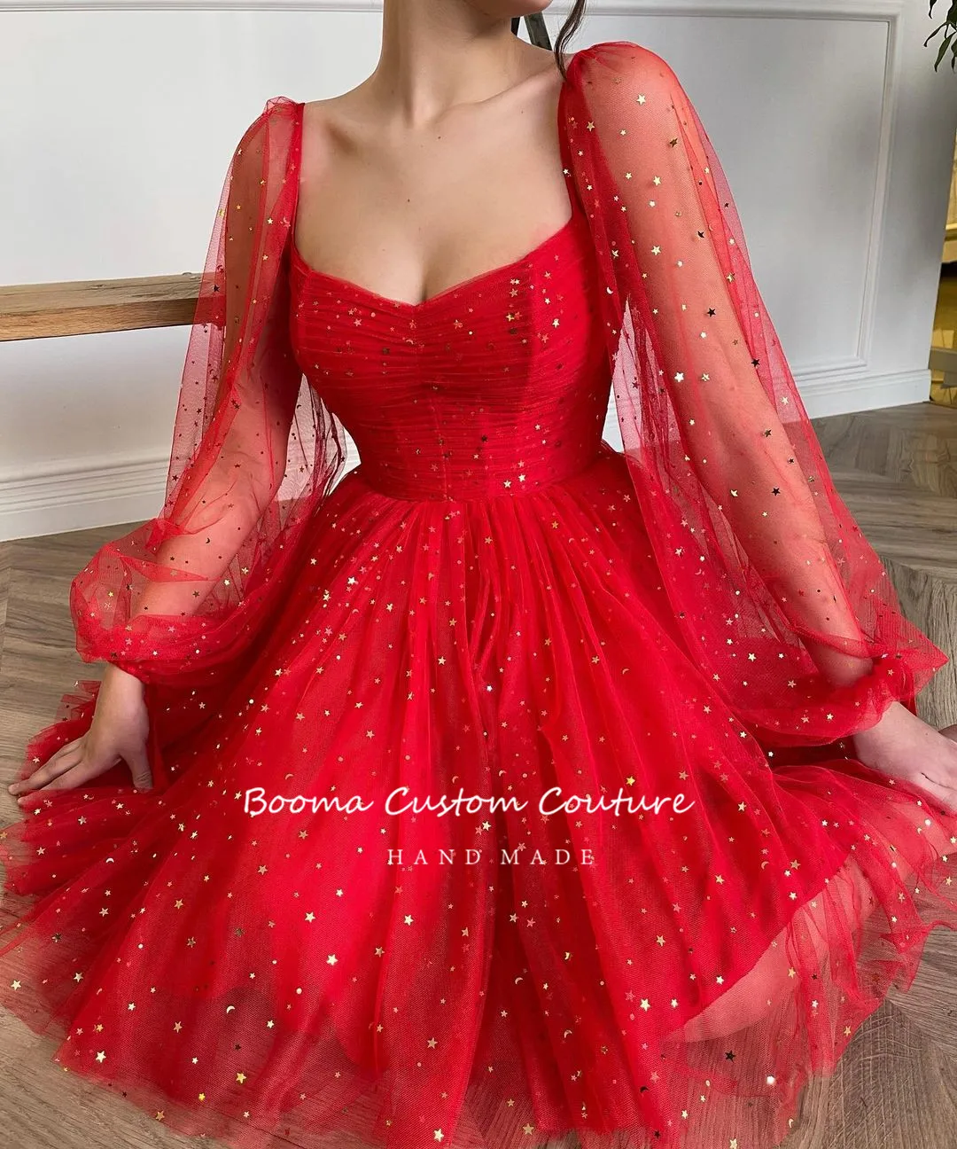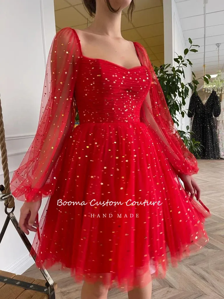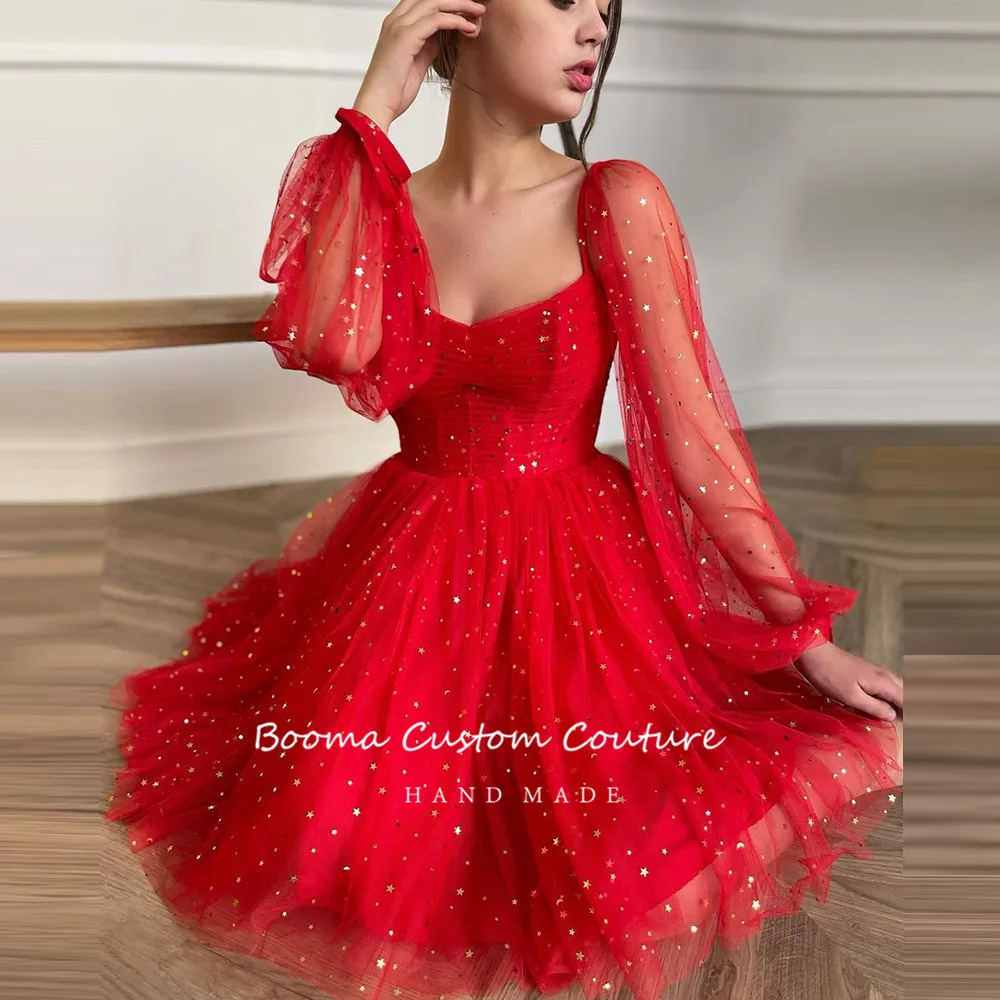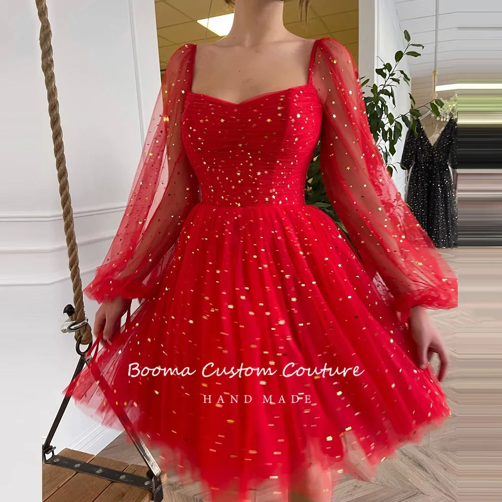 Короткие тюлевые платья Booma, красное платье-трапеция для выпускного вечера с длинными рукавами и открытой спиной, выше колена