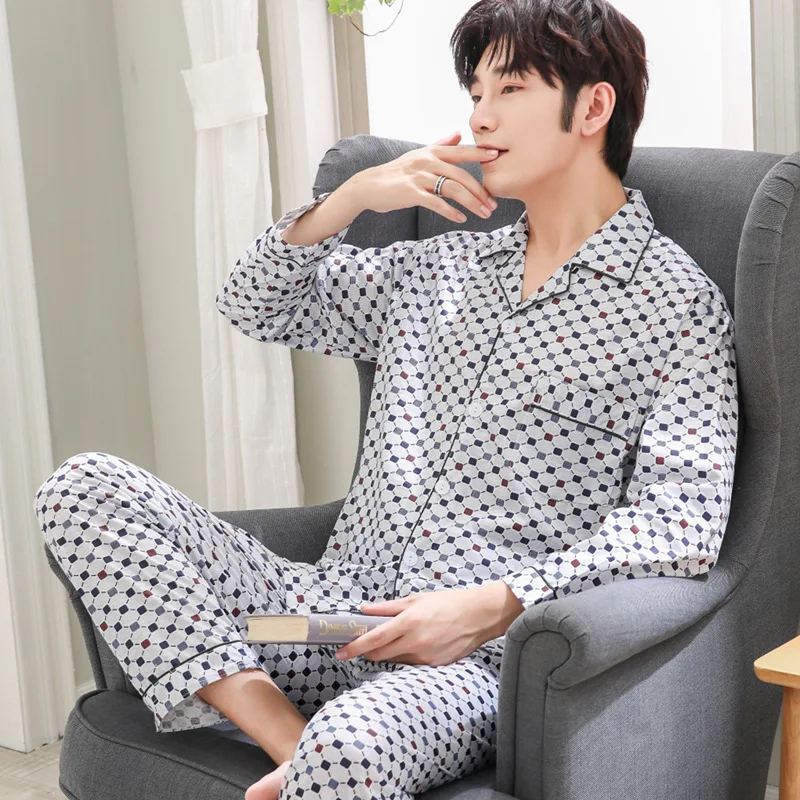 Для мужчин пижамные комплекты большие Размеры 3XL в клетку с длинным рукавом отложной воротник карманы мужской пижамы японский Стиль Простой в стиле Харадзюку