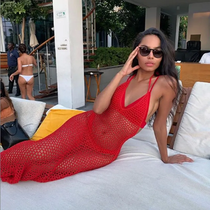 Сексуальное прозрачное платье, туника, ажурные купальные костюмы, длинное платье, женское летнее Сетчатое пляжное платье без рукавов