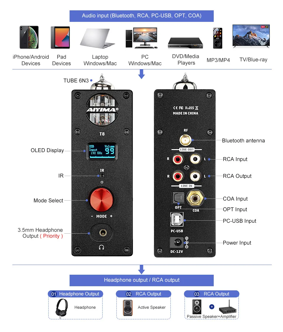 AIYIMA APTX Bluetooth 5,0 6N3 ламповый предусилитель, предварительный усилитель предусилитель USB DAC усилитель для наушников, коаксиальный Оптический Аудио декодирование