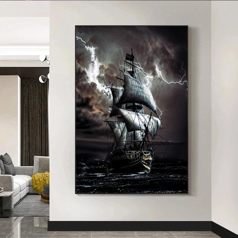 Картина на холсте пиратский корабль в море, винтажные настенные постеры с изображением корабля черного цвета для украшения гостиной