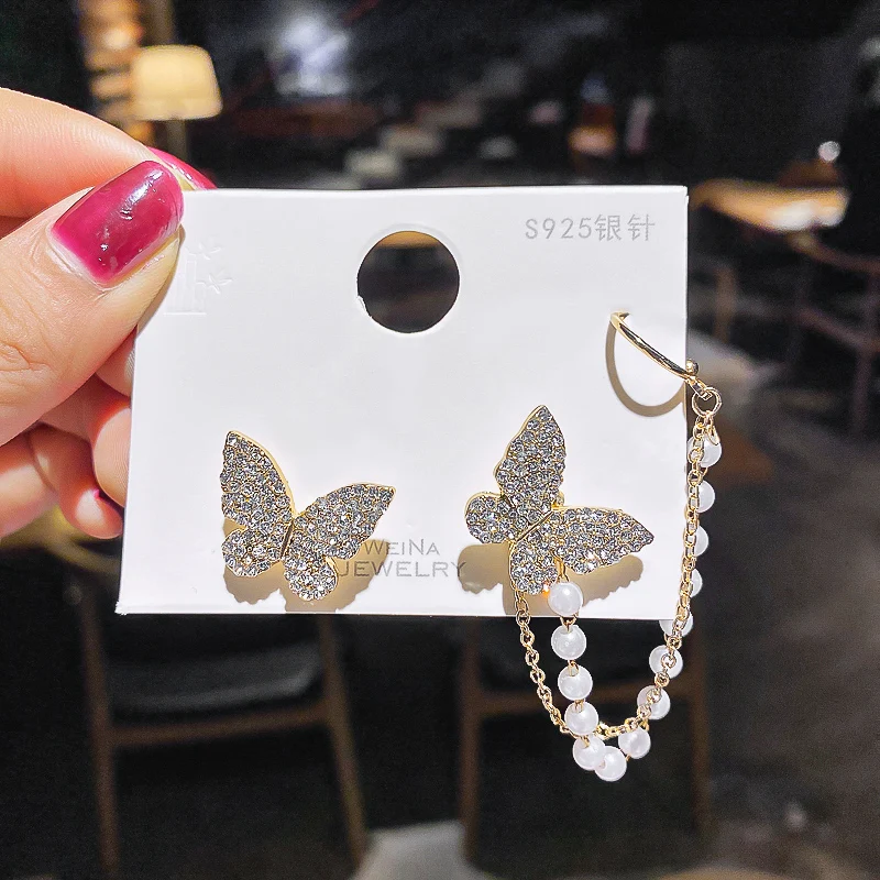 Корейский модный блестящий чехол с украшением в виде кристаллов, с жемчугом, с принтом бабочки серьги Асимметричная стразы, с жемчугом, с принтом бабочки серьги-гвоздики для женщин ювелирные изделия