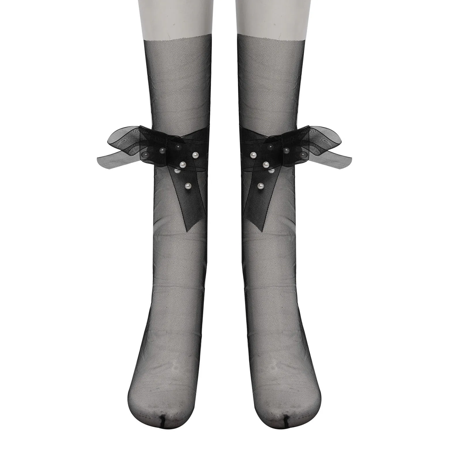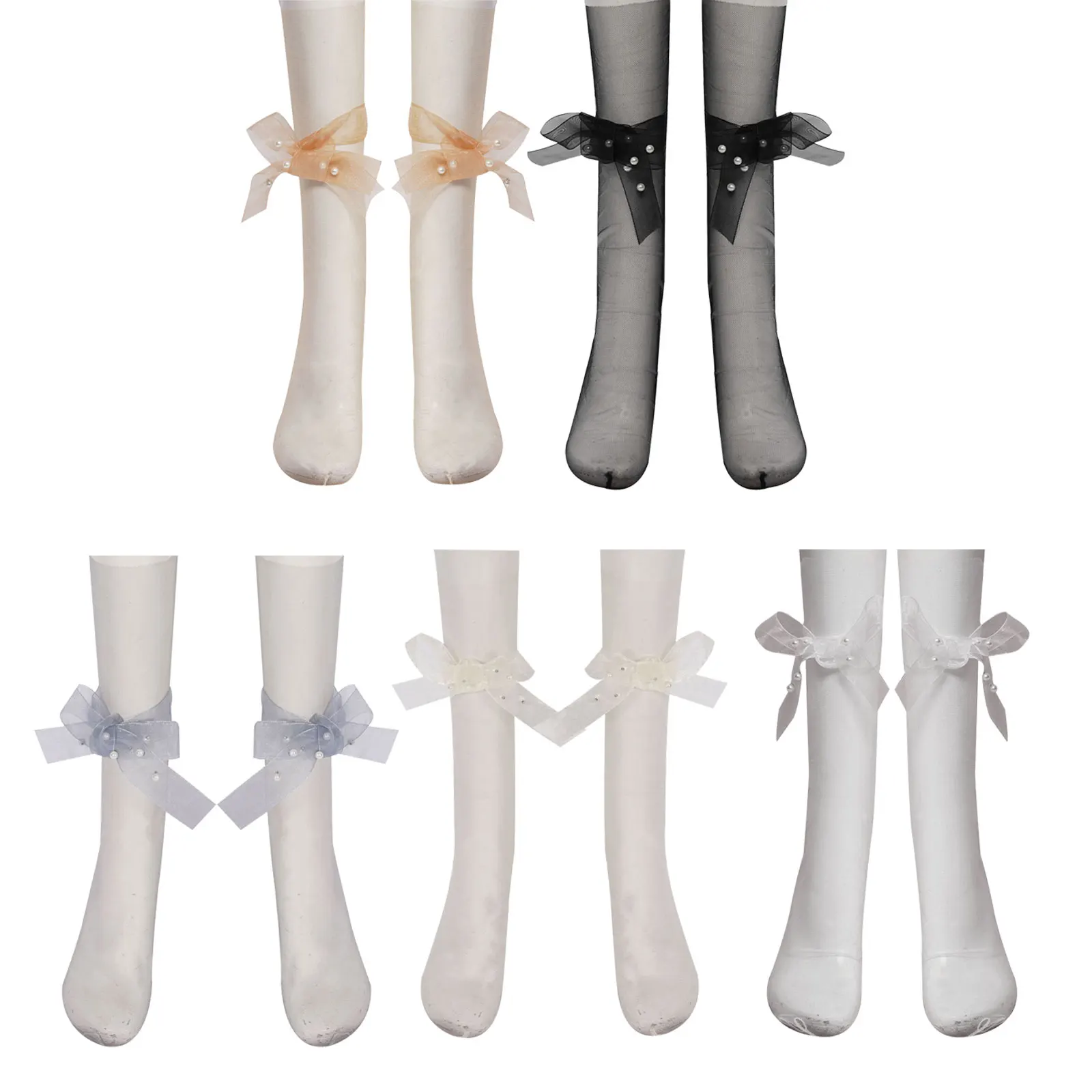 Сексуальные кружевные носки с жемчужным бантом, женские прозрачные сетчатые носки до щиколотки, элегантные женские ультратонкие тюлевые носки принцессы, женские носки