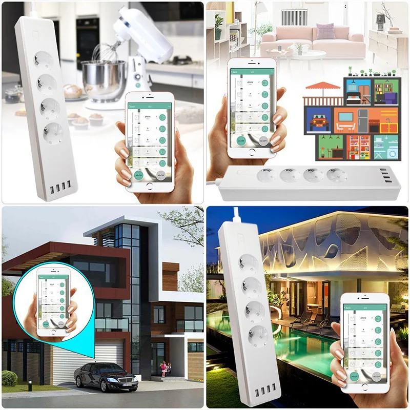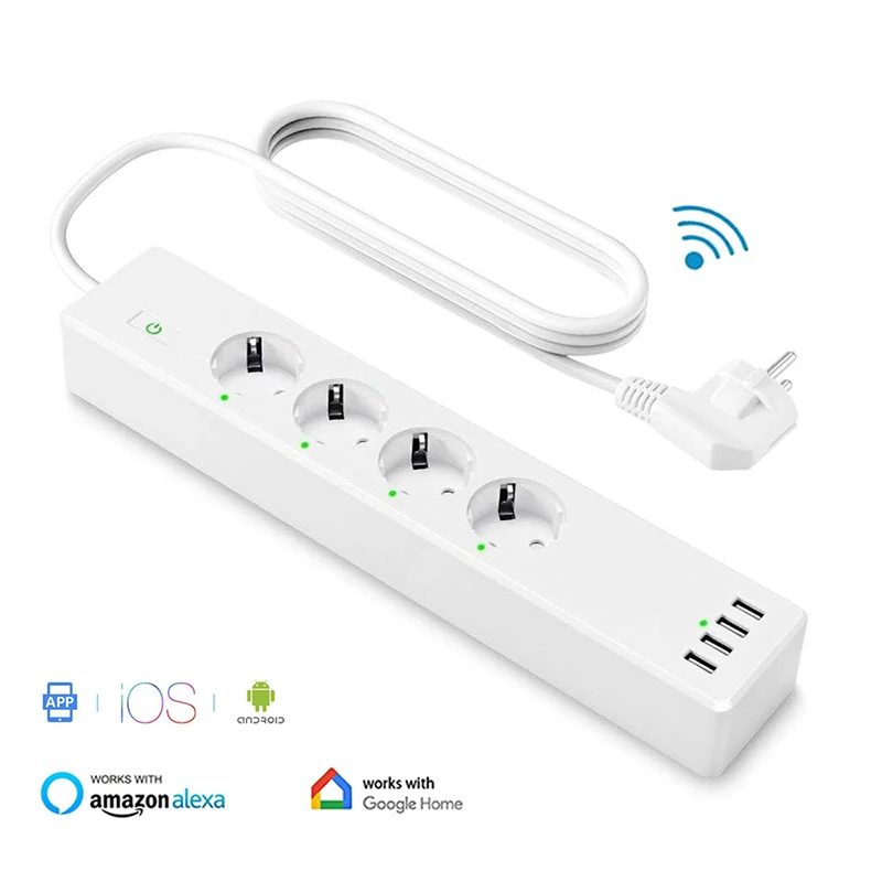 Интеллектуальная многоразовая розетка для 4 отдельно управляемых потребителей. Языковое управление, Голосовое управление через Amazon Echo Alexa, Google Assistant. Вы можете создать таймер, чтобы запланировать управление этим беспроводным мульти-выходным блоком питания. Выключите электрических потребителей в любом месте и в любое время через WIFI или Интернет. Экономит энергию. Сертификат CE ROHS гарантирует безопасное использование.