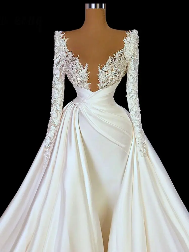 Элегантное кружевное свадебное платье с глубоким V-образным вырезом и длинным рукавом, исламские турецкие кафтаны, на заказ, размера плюс
