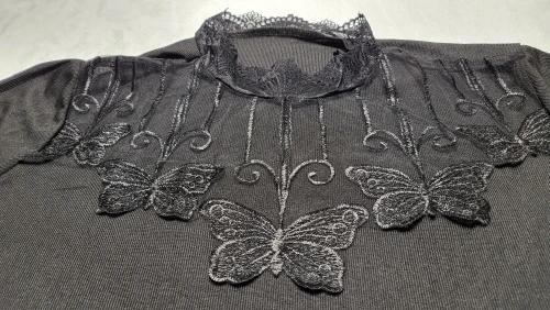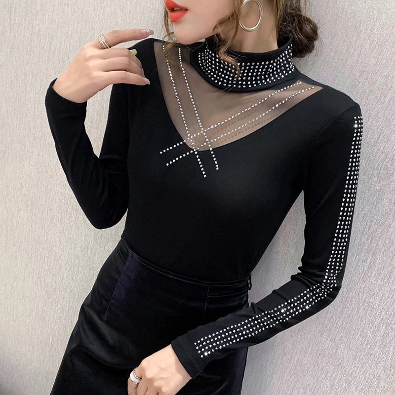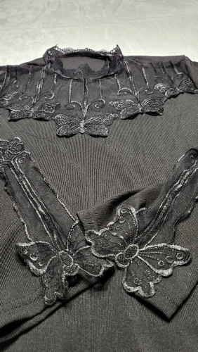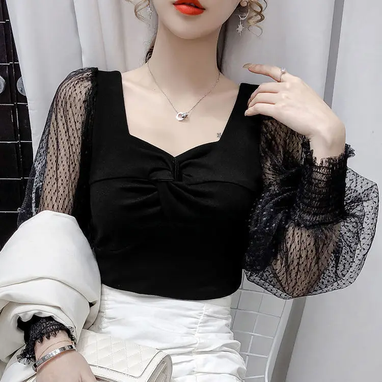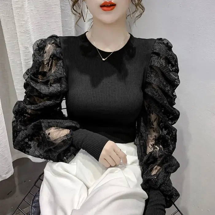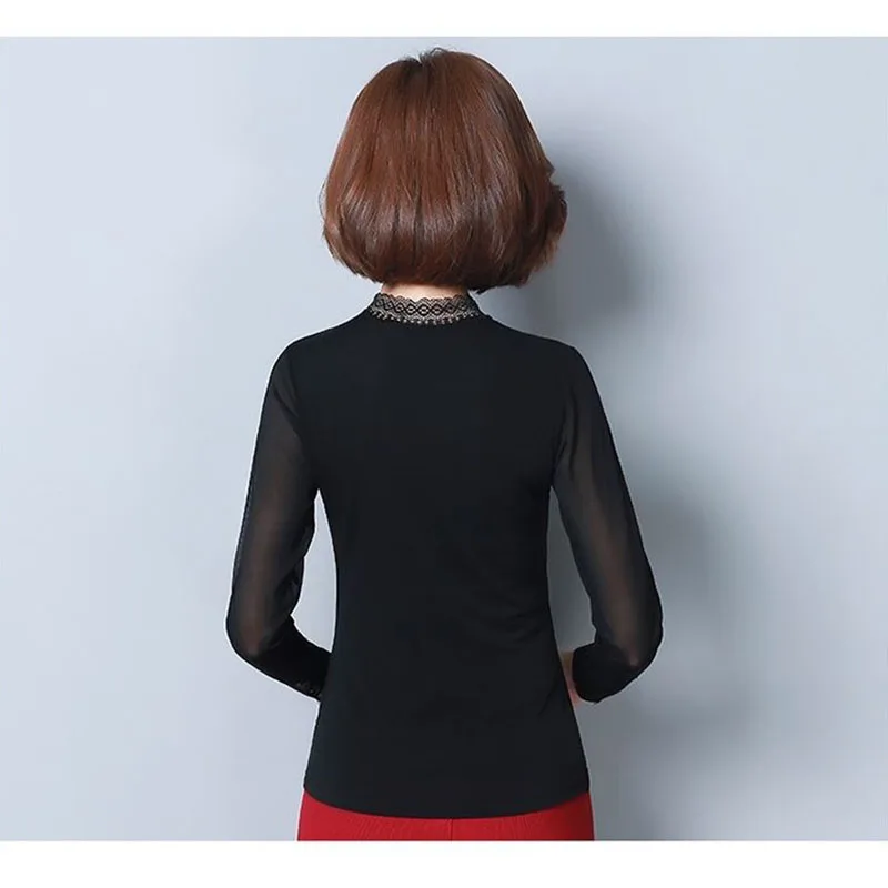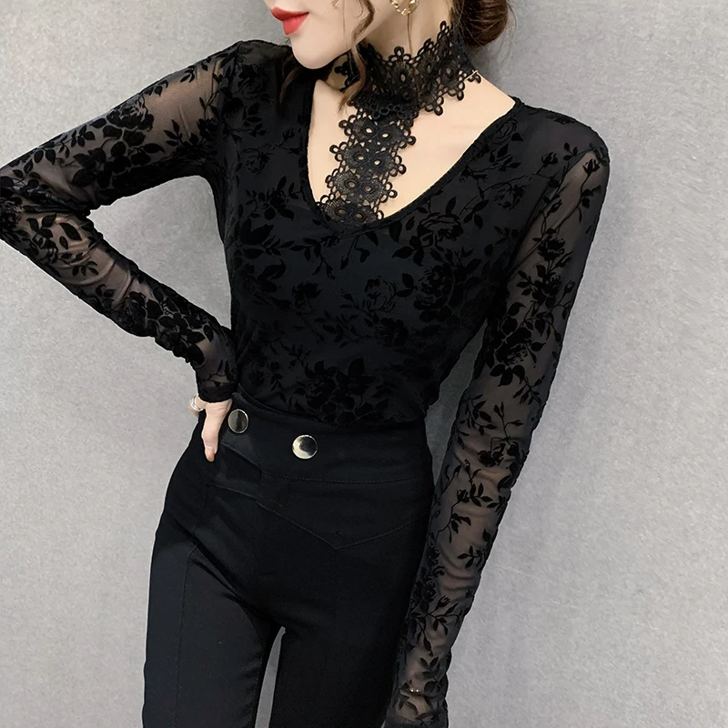 Женская кружевная блузка с длинным рукавом, черная однотонная блузка с вырезами, облегающий топ размера 5XL на весну